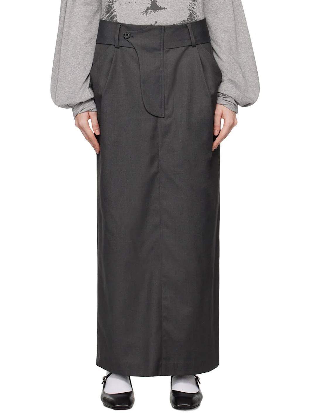 Polyester-blend twill skirt. · Belt loops · Three-pocket styling · Zip-fly · Pleats at front · Darts at back waistband · Full twill lining Supplier color: Grey Body: 70% polyester, 20% rayon, 10% wool. Lining 1: 100% polyester. Lining 2: 80% polyester, 20% cotton. Made in South Korea 242731F093001