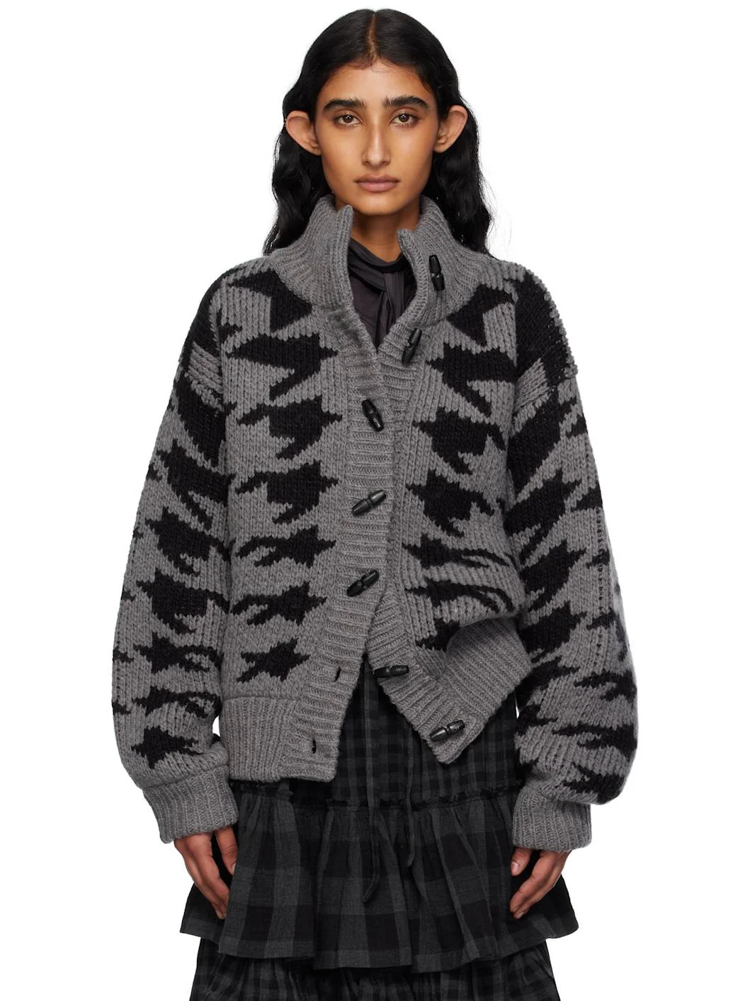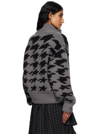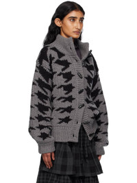 Knit wool-blend cardigan. · Jacquard houndstooth pattern throughout · Rib-knit funnel neck, hem, and cuffs · Toggle closure · Dropped shoulders · Logo-engraved hardware Supplier color: Gray 60% acrylic, 40% wool. Made in South Korea 252731F095005