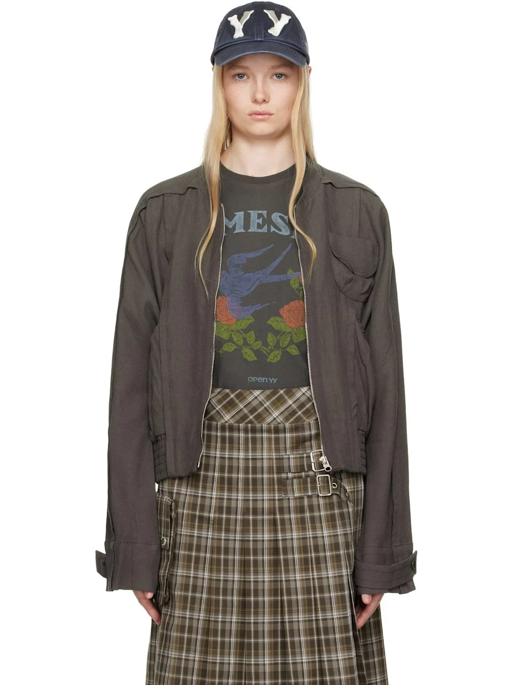 Linen-blend hopsack bomber jacket. · Paneled construction · Stand collar · Zip closure · Patch pocket at chest · Shirred elasticized hem · Elasticized patch pocket at side seams · Adjustable button tab at cuffs Supplier color: Charcoal 55% linen, 23% cotton, 22% rayon. Made in South Korea 251731F063010