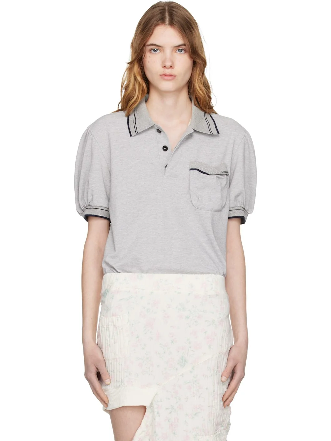 Cotton pique polo. · Striped rib-knit spread collar and cuffs · Button placket · Twisted patch pocket at chest · Puff sleeves · Vented side seams Supplier color: Gray 100% cotton. Made in South Korea 261731F108000
