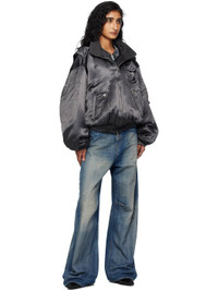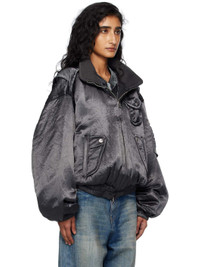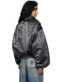 Insulated satin bomber jacket. · Stand collar · Two-way zip closure · Patch pocket at chest · Flap pockets at waist · Elasticized hem and cuffs · Dropped shoulders · Utility pocket and pen slots at sleeve · Rib-knit interior collar · Welt pocket at interior · Twill lining · Logo-engraved silver-tone hardware Supplier color: Charcoal Body 1: 100% acetate. Body 2: 70% acrylic, 23% polyester, 7% polyurethane. Fill: 100% polyester. Lining: 100% polyester. Made in South Korea 252731F058000
