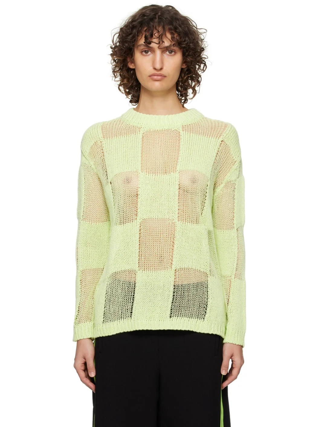 Semi-sheer open knit paper yarn- and cotton-blend sweater. Check pattern throughout. · Rib knit crewneck, hem, and cuffs · Dropped shoulders Supplier color: Light green 50% paper yarn, 50% cotton. Made in South Korea 231731F096015