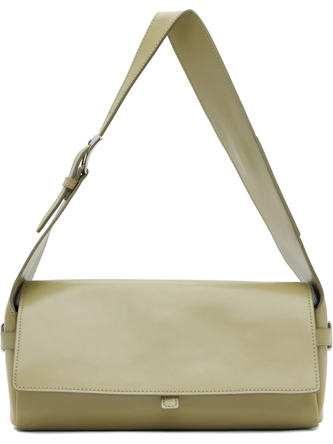 Buffed leather shoulder bag. · Adjustable pin-buckle shoulder strap · Patch pocket and logo stamp at strap · Post-stud strap at face · D-ring at sides · Integrated strap with adjustable press-studs at back face · Embossed logo at back face · Flap closure · Patch pocket at interior · Twill lining · Silver-tone hardware · H5.5" x W11" x D4.5" Supplier color: Olive Leather. Made in South Korea 252731F048007