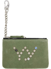 Suede wallet. · Studded logo with crystal-cut accents at face · Logo-embossed loop at back face · Zip closure · Integrated curb chain lanyard clasp · Twill lining · H3.5" x W5.25" x D0.5" Supplier color: Olive Leather. Made in South Korea 252731F040001