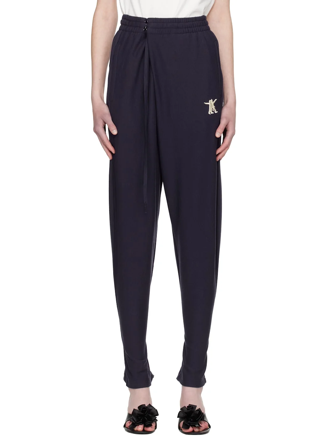 Cotton pique sweatpants. · Elasticized waistband · Wrap waist with hook-eye clasp · Four-pocket styling · Embroidered logo at front leg · Hook-eye fastening at back cuffs Supplier color: Navy 100% cotton. Made in South Korea 261731F086004