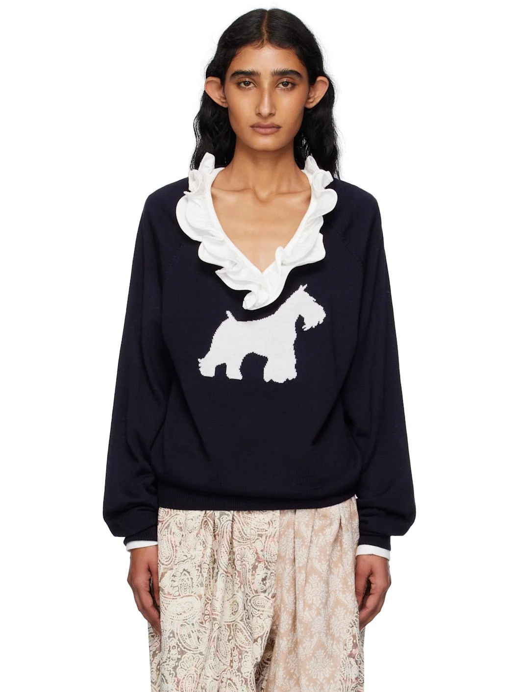 Knit wool-blend sweater. · Rib-knit V-neck, hem, and cuffs · Intarsia graphic at front · Raglan sleeves Supplier color: Navy 70% acrylic, 30% wool. Made in South Korea 252731F096005