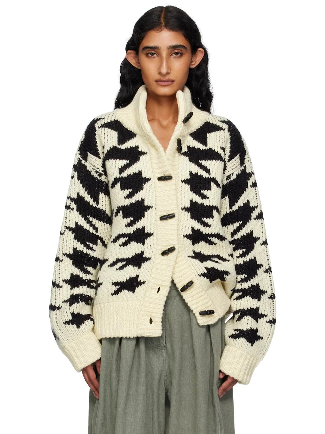 Knit wool-blend cardigan. · Jacquard houndstooth pattern throughout · Rib-knit funnel neck, hem, and cuffs · Toggle closure · Dropped shoulders · Logo-engraved hardware Supplier color: Ivory 60% acrylic, 40% wool. Made in South Korea 252731F095006
