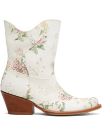 Mid-calf canvas boots. · Floral pattern printed throughout · Pointed toe · Buffed leather lining · Topstitching at welt · Stacked block heel with rubber injection · Rubber sole · Heel: H2.25" Supplier color: Muti Upper: leather, textile. Sole: rubber. Made in South Korea 261731F114002