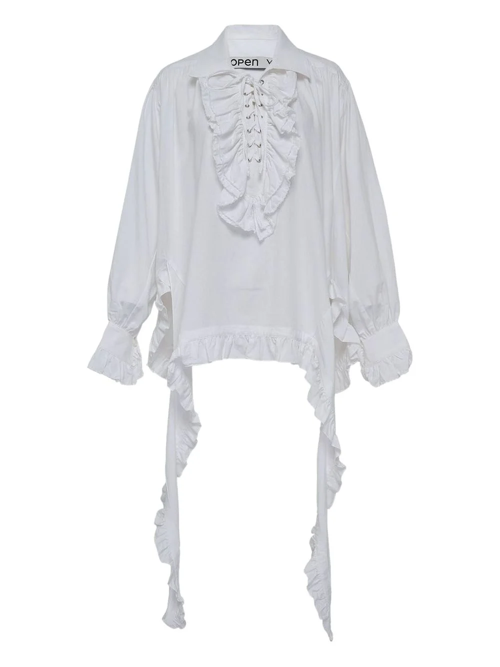 ruffled lace-up blouse Highlights - White - Lace-up front - Ruffled neckline - Ruffled hem - Long sleeves - Ruffled cuffs Imported Composition Rayon 57%, Cotton 43% Washing instructions Read Manufacturer Guidelines