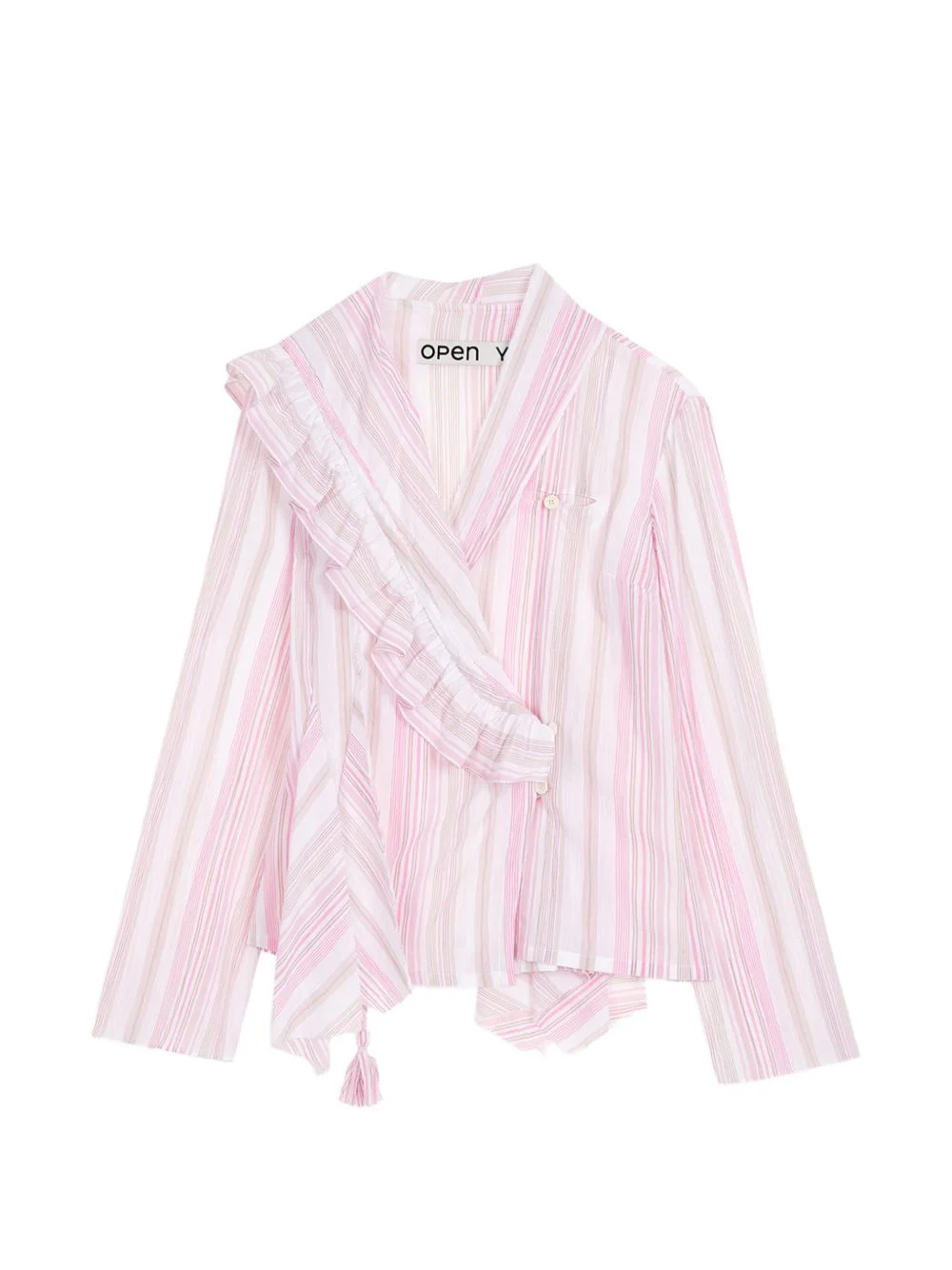 ruffled stripe blouse Highlights - Pink white - Stripe pattern - Ruffle trim - Tie detail - Long sleeves - Asymmetric hem Imported Composition Outer: Cotton 100%