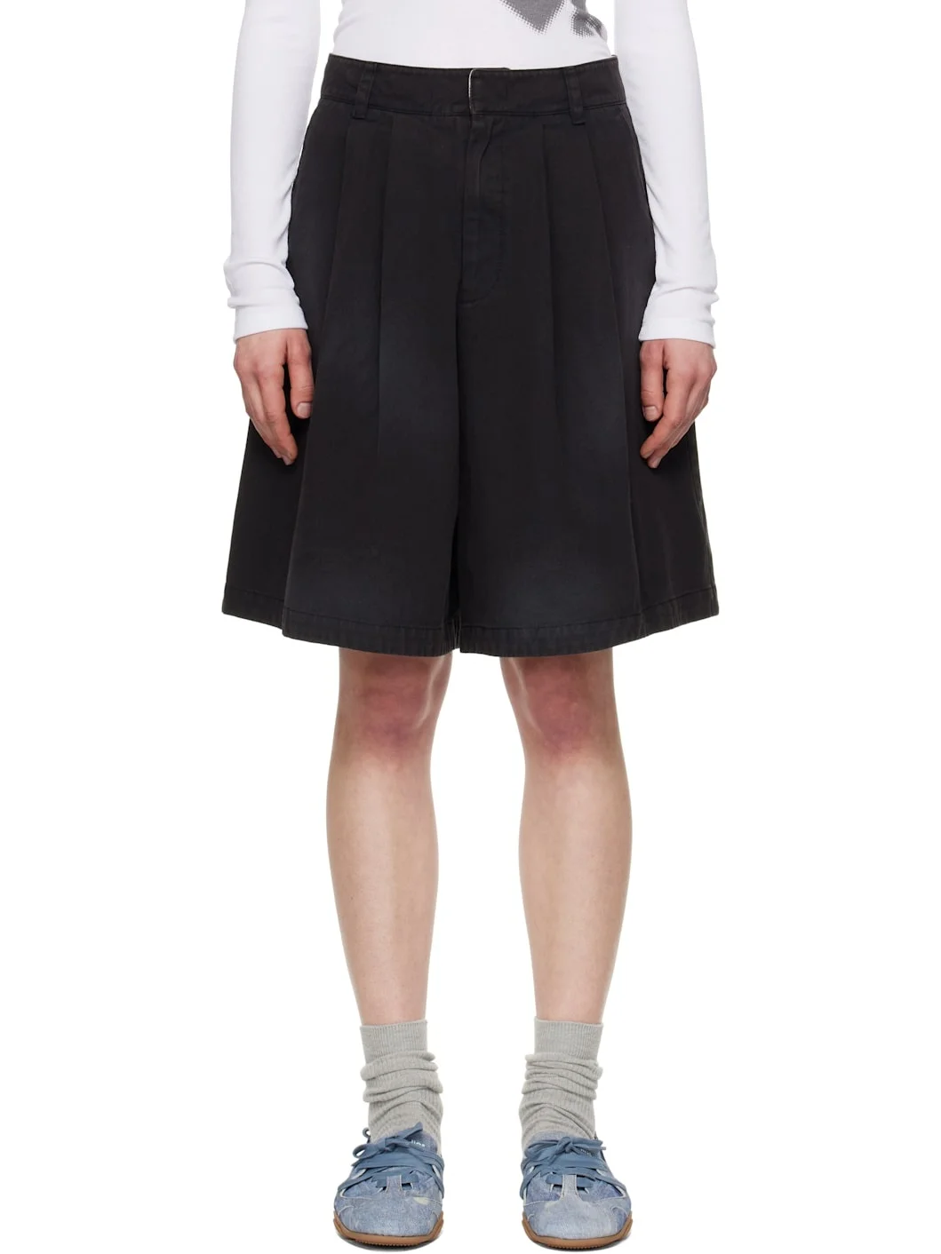 Wide-leg cotton gabardine shorts. Fading throughout. · Mid-rise · Belt loops · Two-pocket styling · Zip fly · Pleats at front Supplier color: Black Body: 100% cotton. Lining: 80% polyester, 20% cotton. Made in South Korea 251731F088003