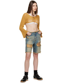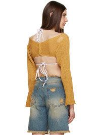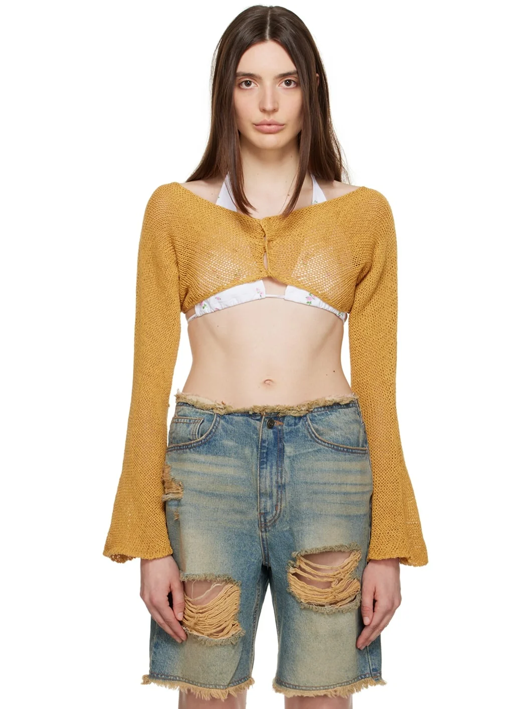 Open knit cotton- and paper-blend cardigan. · Scoop neck · Button closure at front and back · Cropped hem · Flared cuffs Supplier color: Mustard 50% cotton, 50% paper. Made in South Korea 231731F095025