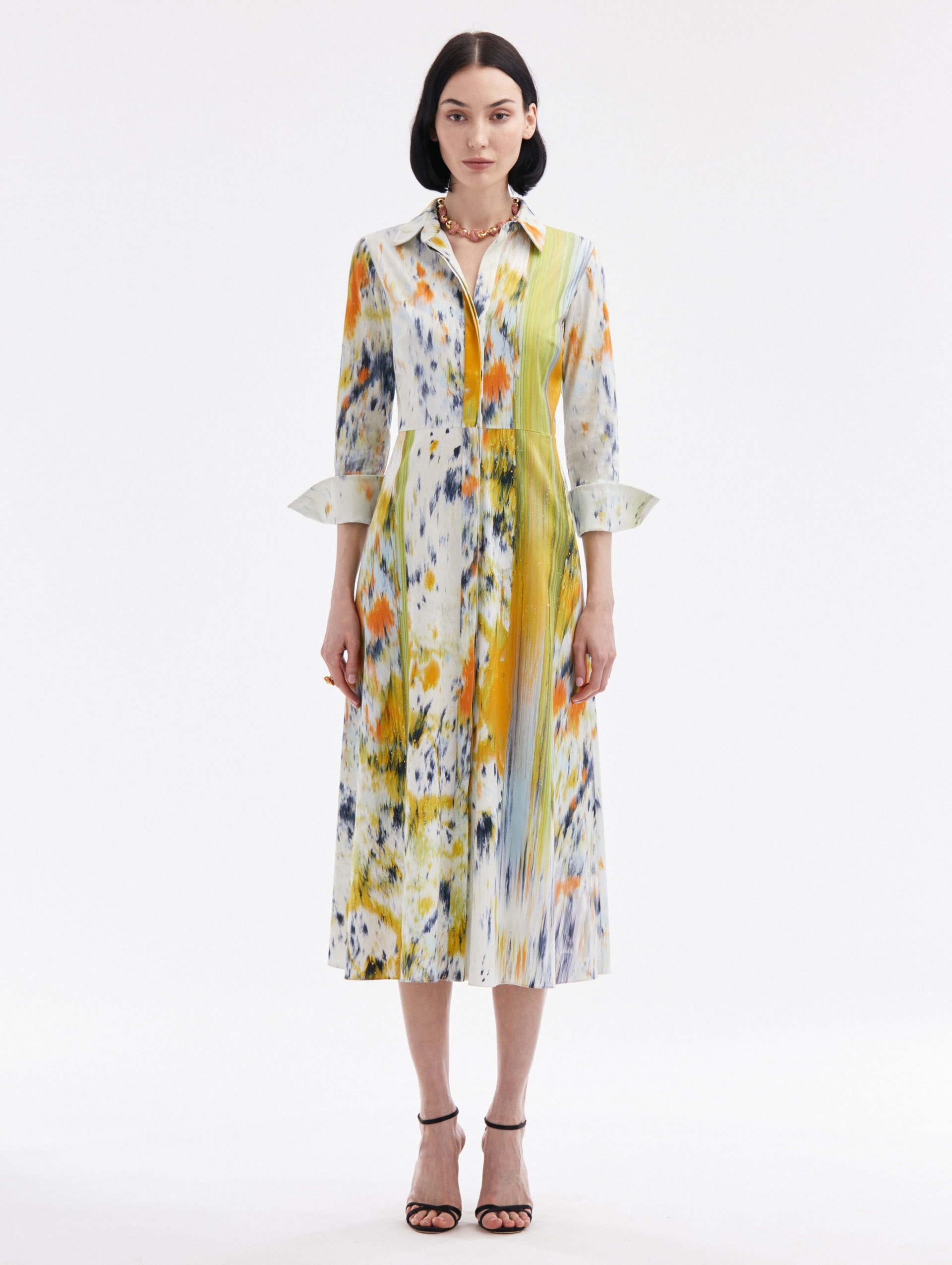 EMBRACING VIVID ABSTRACTION, BRUSHSTROKES OF CALENDULA, LIGHT BLUE, BUTTER YELLOW AND MIDNIGHT PERMEATE THIS STATEMENT DRESS. CRAFTED FROM COTTON RASO, THIS PIECE IS COMPLETE WITH A CONCEALED BUTTON FRONT AND THREE-QUARTER-LENGTH SLEEVES. THREE-QUARTER-LENGTH SLEEVES / SHIRT COLLAR / CONCEALED BUTTON FRONT / BELOW THE KNEE LENGTH / UNLINED / DRY CLEAN DIMENSIONS: MODEL IS 5'10.5" / 180 CM AND WEARING SIZE 2 MATERIAL: 97% COTTON, 3% ELASTANE MADE IN ITALY STYLE 24PN260ABR_CTN