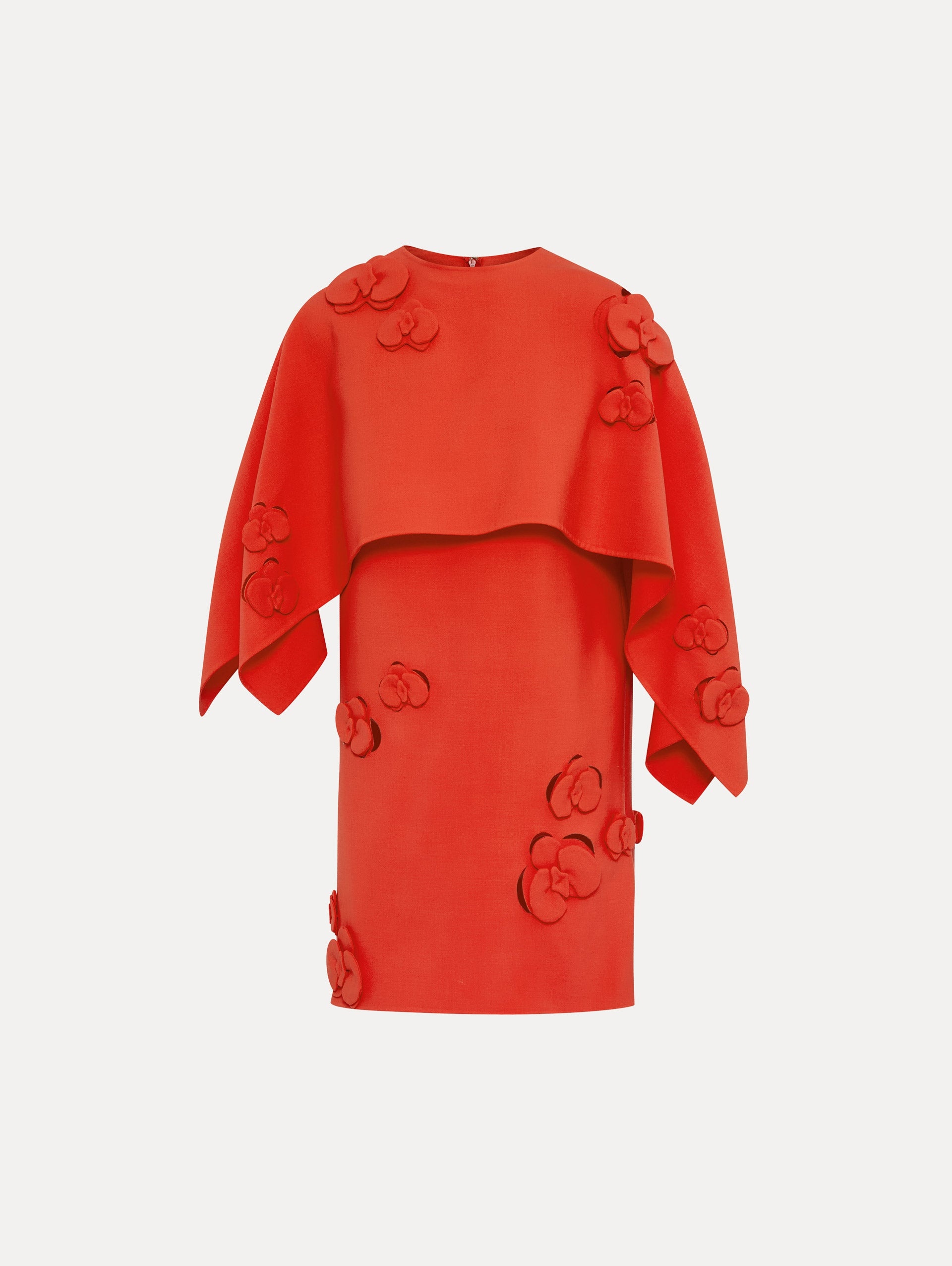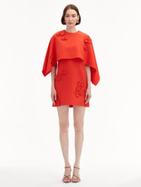 Brighten your everyday style with this dress. This mini features eye-catching three-dimensional orchid cutouts that add a touch of artistic flair, while the removable capelet offers versatile styling options. Details - Sleeveless - Jewel Neckline - Removable Capelet - Below the Knee Length - Side Seam Pockets - Concealed Back Zipper - Style Code: 25RE279DSW_VRM Materials & Care - 94% Virgin Wool, 5% Elastane, 1% Polyamide