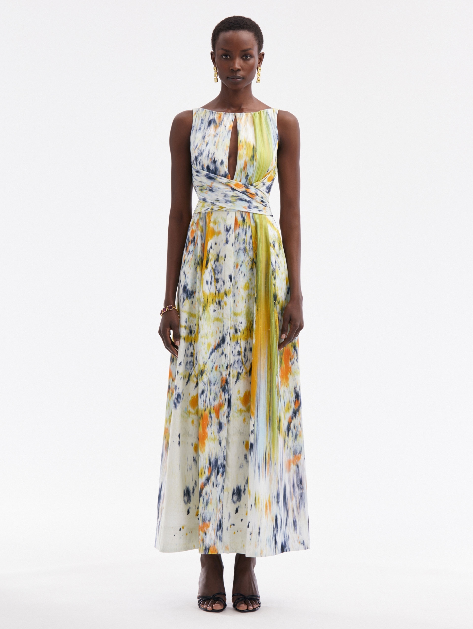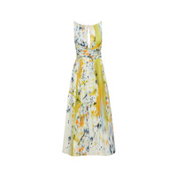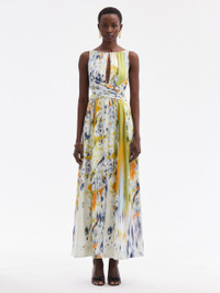 EMBRACING VIVID ABSTRACTION, THIS DAY DRESS FINDS ITS INSPIRATION IN A COMMISSIONED CANVAS OF BROOKLYN-BASED ARTIST JOE HENRY BAKER. CRAFTED FROM COTTON RASO, THIS PIECE IS COMPLETED WITH A GATHERED NECKLINE AND CUTOUT DETAILING. SLEEVELESS / GATHERED NECKLINE WITH CUTOUT DETAIL / OPEN BACK WITH SELF-TIE CLOSURE / SELF-TIE WAIST DETAIL / CONCEALED BUTTON FRONT SKIRT / CONCEALED BACK ZIPPER / SIDE SEAM POCKETS / 100% COTTON LINING / DRY CLEAN DIMENSIONS: MODEL IS 5'10.5" / 180 CM AND WEARING SIZE 2 MATERIAL: 97% COTTON, 3% ELASTANE; BODICE LINING: 100% COTTON MADE IN ITALY STYLE 24PN234ABR_CTN
