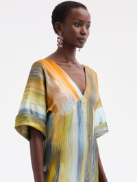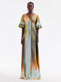 HUES LIFTED FROM A COMMISSIONED CANVAS OF BROOKLYN-BASED ARTIST JOE HENRY BAKER PERMEATE THIS EVENING GOWN. WITH A PLUNGING NECKLINE AND RELAXED SILHOUETTE, THIS PIECE IS A PARADIGM FOR THE HOUSE'S MASTERY OF ELEVATED EVENTWEAR. SHORT SLEEVES / V-NECKLINE / OPEN BACK WITH SELF-TIE CLOSURES / FLOOR-SWEEPING HEMLINE WITH SHORT TRAIN / CONCEALED BACK ZIPPER / UNLINED / DRY CLEAN DIMENSIONS: MODEL IS 5'10.5" / 180 CM AND WEARING SIZE 2 MATERIAL: 100% VISCOSE; PIPING: 100% SILK MADE IN ITALY STYLE 24PN040AVM_CDU