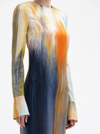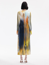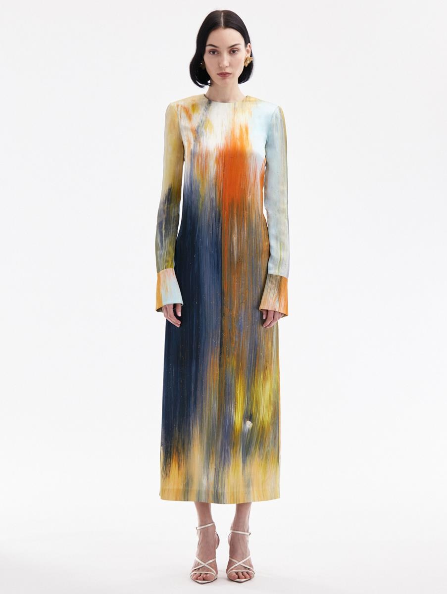 EMBRACING VIVID ABSTRACTION, BRUSHSTROKES OF CALENDULA, LIGHT BLUE, BUTTER YELLOW AND MIDNIGHT PERMEATE THIS STATEMENT DRESS. CRAFTED FROM DECADENT MAROCAINE, THIS PIECE IS COMPLETE WITH A JEWEL NECKLINE AND CENTER BACK SLIT. LONG SLEEVES WITH BUTTON CUFFS / JEWEL NECKLINE / FULL LENGTH / CENTER BACK SLIT / CONCEALED BACK ZIPPER / UNLINED / DRY CLEAN DIMENSIONS: MODEL IS 5'10.5" / 180 CM AND WEARING SIZE 2 MATERIAL: 94% VISCOSE, 6% ELASTANE MADE IN ITALY STYLE 24PN259AVM_CDU
