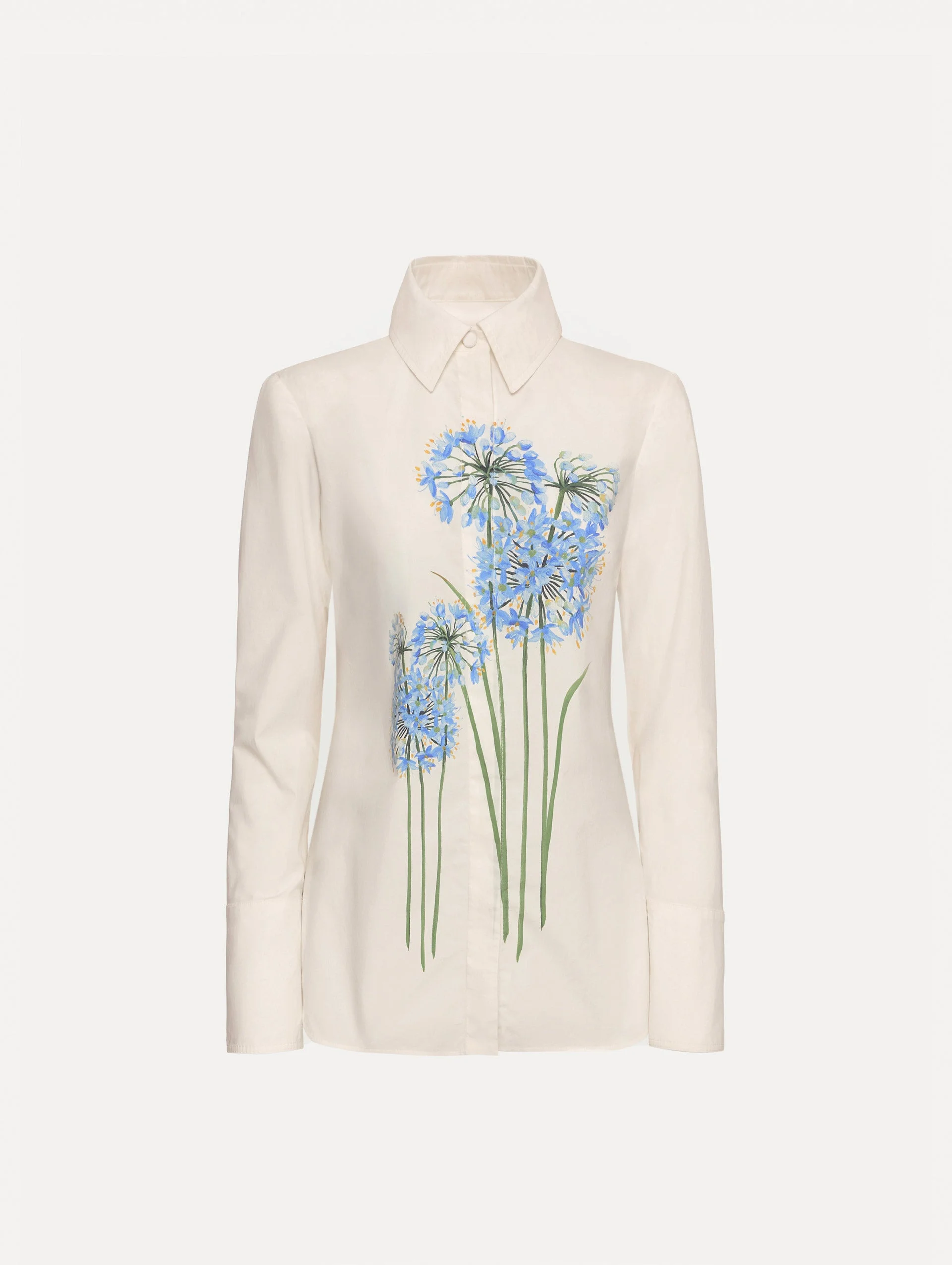 Crisp cotton poplin forms the canvas for this timeless blouse, where painterly alliums bloom in soft shades of blue and green. Tailored with a sharp collar and clean lines, it marries classic structure with botanical artistry. Details - Long Sleeves with Button Cuffs - Spread Collar - Concealed Button Front - Self-Tie Back Sash - Unlined - Country of Origin: Italy - Style Code: 26RN714ACB_BWE Materials & Care - 97% Cotton, 3% Elastane - Dry clean only.