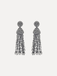 A cascade of delicate beads forms these chandelier earrings, with a fluid tassel that sways elegantly with every movement. Tonal beading at the top creates a seamless, luminous effect, adding to their refined artistry. Details - Dimensions: 9.2 cm x 3 cm - Weight: 48 grams - Clip Backs with Comfort Pads - Style Code: P25J182_SIL - Country of Origin: India Materials & Care - 80% Glass, 3% Polyamide, 17% Brass