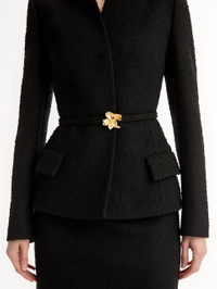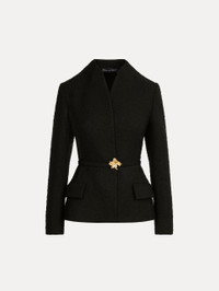 This wool tweed jacket is shaped with a nipped waist and sculpted shoulders, offering a modern interpretation of timeless tailoring. A polished gold cyclamen belt closure draws the eye to the silhouette’s precise lines. Details - Long Sleeves - Shawl Collar - Self-Belt - Fron Flap Pockets - Style Code: 26SN507SWW_BLK - Country of Origin: Italy Materials & Care - 56% Polyester, 44% Viscose Wool Rws; Lining: 100% Silk - Dry clean only.