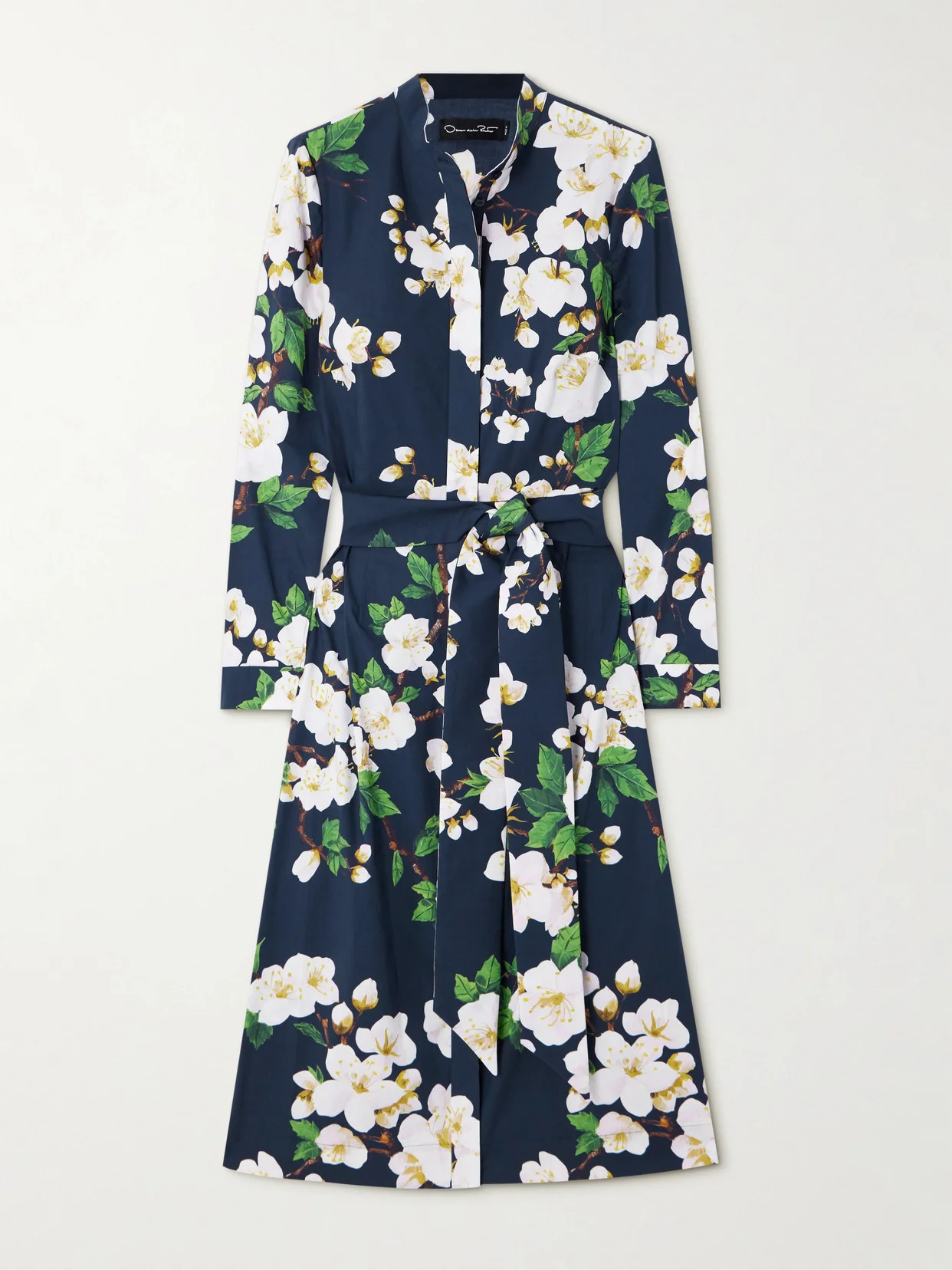 Oscar de la Renta's shirt dress is patterned with beautiful cherry blossoms in full bloom. Cut from cotton-poplin with a touch of stretch, it has a self-tie belt to define the shape and covered buttons through the front for a streamlined finish.