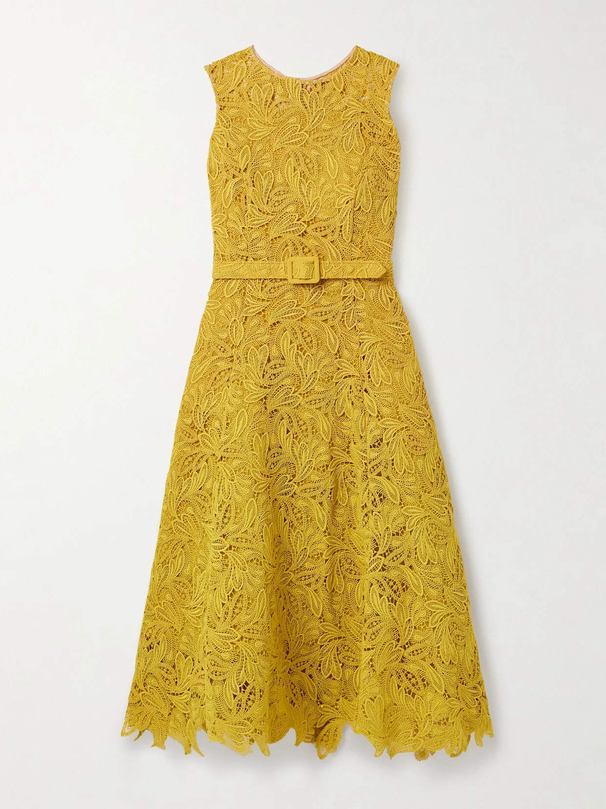 Oscar de la Renta's midi dress is made from guipure lace that always feels feminine - look closely to appreciate the detailed floral needlework. It's darted through the body and has a matching waistbelt and a flowing midi skirt. The tonal lining offers ample coverage.