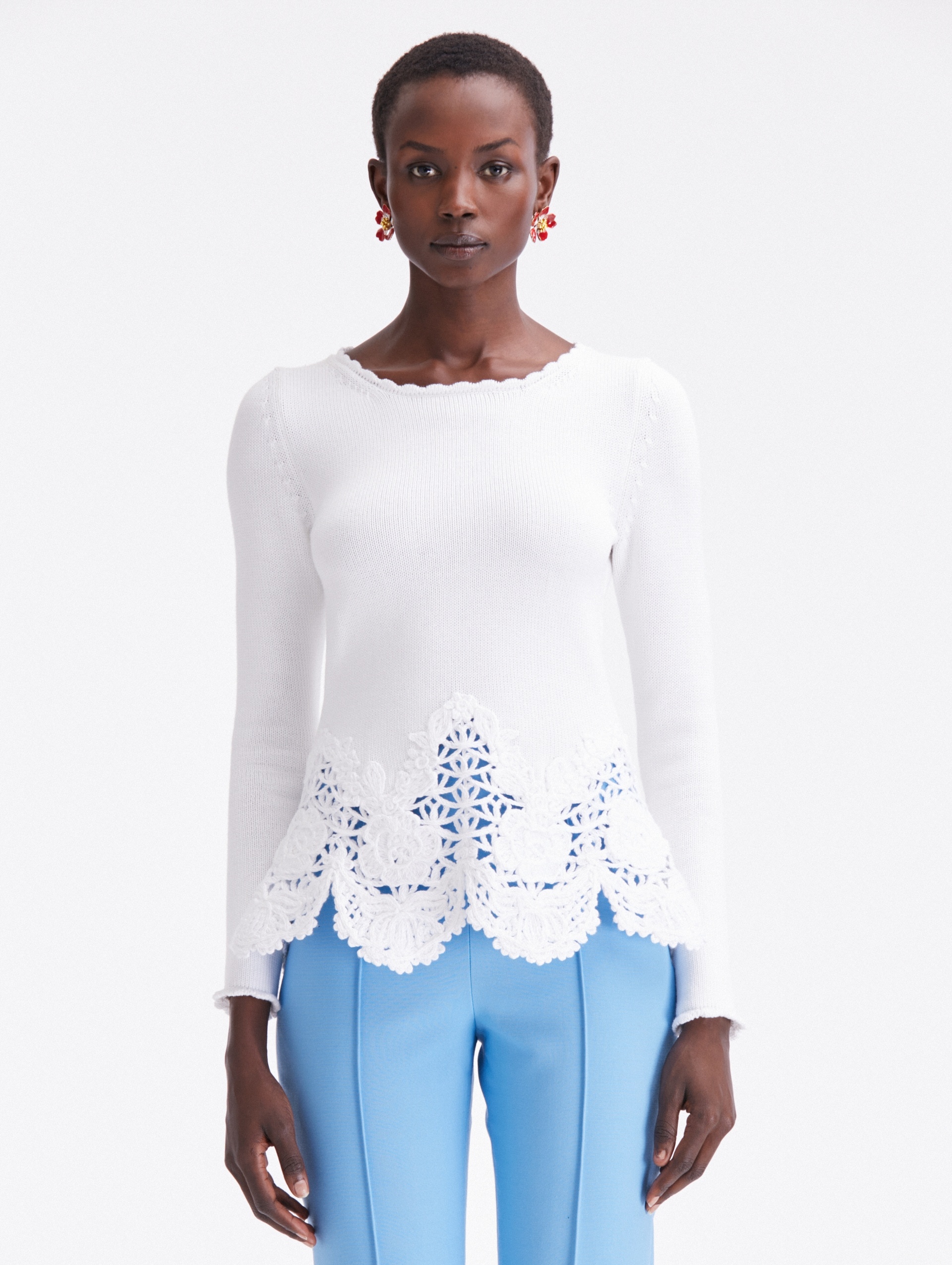 KNIT IN LIGHTWEIGHT COTTON, THIS PULLOVER SHOWCASES SCALLOPED BIRDSNEST EMBROIDERY AT THE HEM. WITH LONG SLEEVES AND A BACK BUTTON KEYHOLE DETAIL, THIS PIECE IS SURE TO ELEVATE YOUR EVERYDAY. LONG SLEEVES / JEWEL NECKLINE / PULLOVER STYLE / HIP-LENGTH / KEYHOLE BACK CLOSURE / SCALLOP TRIM / DRY CLEAN DIMENSIONS: MODEL IS 5'10" / 180 CM AND WEARING SIZE S MATERIAL: 100% COTTON MADE IN ITALY STYLE 24RN153BIR_IVR
