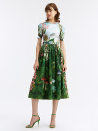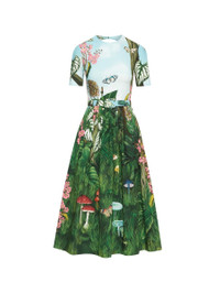 A FAVORITE SILHOUETTE SEASON AFTER SEASON, THIS MIDI DRESS HAS BEEN ELEVATED WITH THE VIBRANT BOTANICAL FOREST MOTIF. CUT FROM LIGHTWEIGHT COTTON POPLIN, THIS STYLE IS COMPLETE WITH A COORDINATING BUCKLE BELT AND A STRIKING CUTOUT BACK. JEWEL NECK / SHORT SLEEVES / COORDINATING BUCKLE BELT / BOW EMBELLISHED BACK CUTOUT / SIDE SEAM POCKETS / DRY CLEAN DIMENSIONS: MODEL IS 5'11" / 180 CM AND WEARING SIZE 2 MATERIAL: 97% COTTON 3% ELASTANE MADE IN ITALY STYLE 23RN204BFN_GRM
