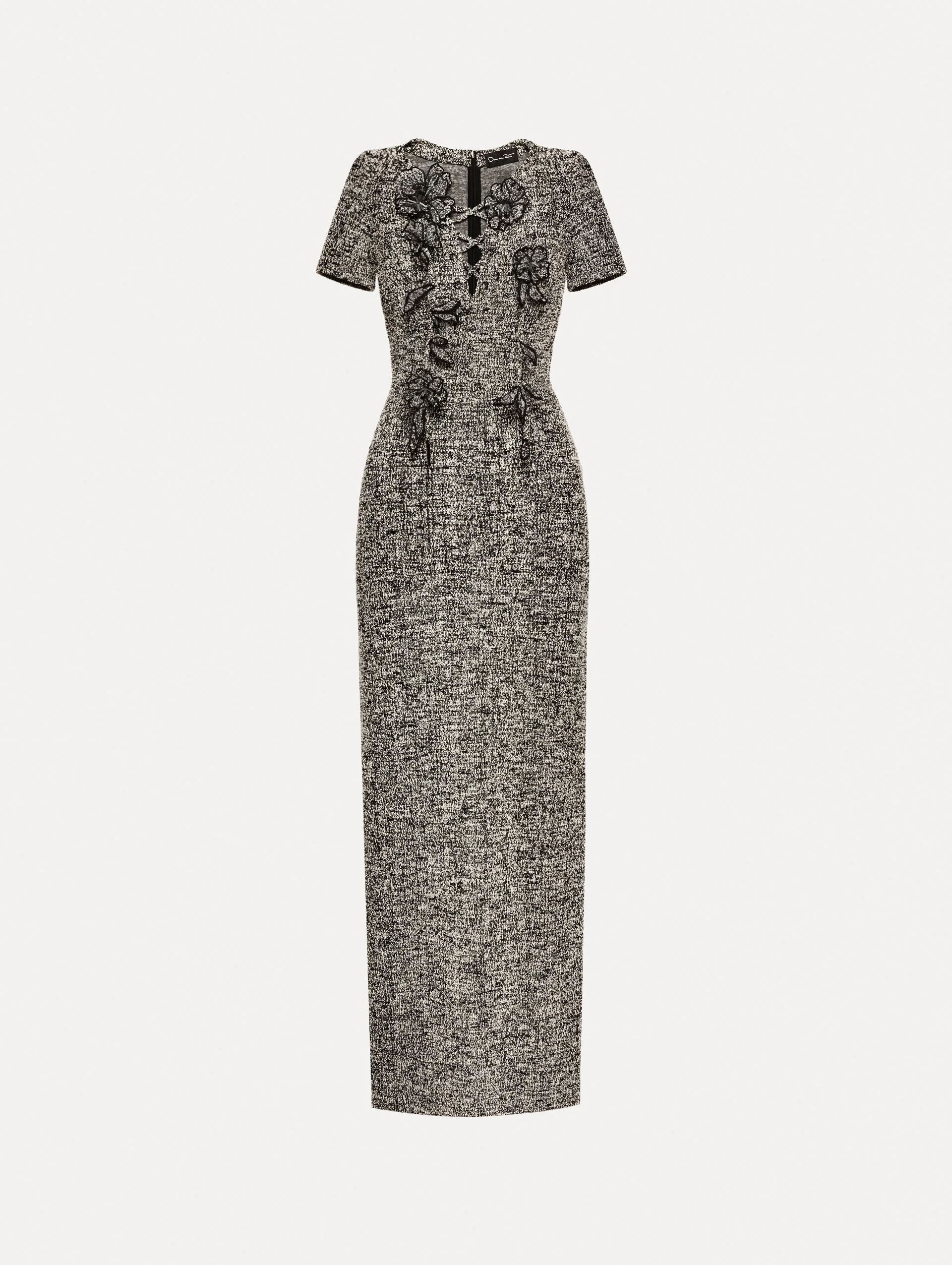 This dress combines the textured richness of tweed with the flexibility of jersey, offering a structured yet supple silhouette that moves with ease. A refined lace-up neckline adds a sense of ease and femininity, punctuated by delicately embroidered floral appliques. Details - Short Sleeves - V-Neckline with Self-Tie Closure - Column Silhouette - Concealed Back Zipper - Center Back Slit - Unlined - Style Code: 25FE266BYT_BLI - Country of Origin: Italy Materials & Care - - 83% Cotton, 11% Polyester, 5% Polyamide, 1% Elastane - - Spot clean only. - - Do not dry clean, iron, steam, bleach, or wash.