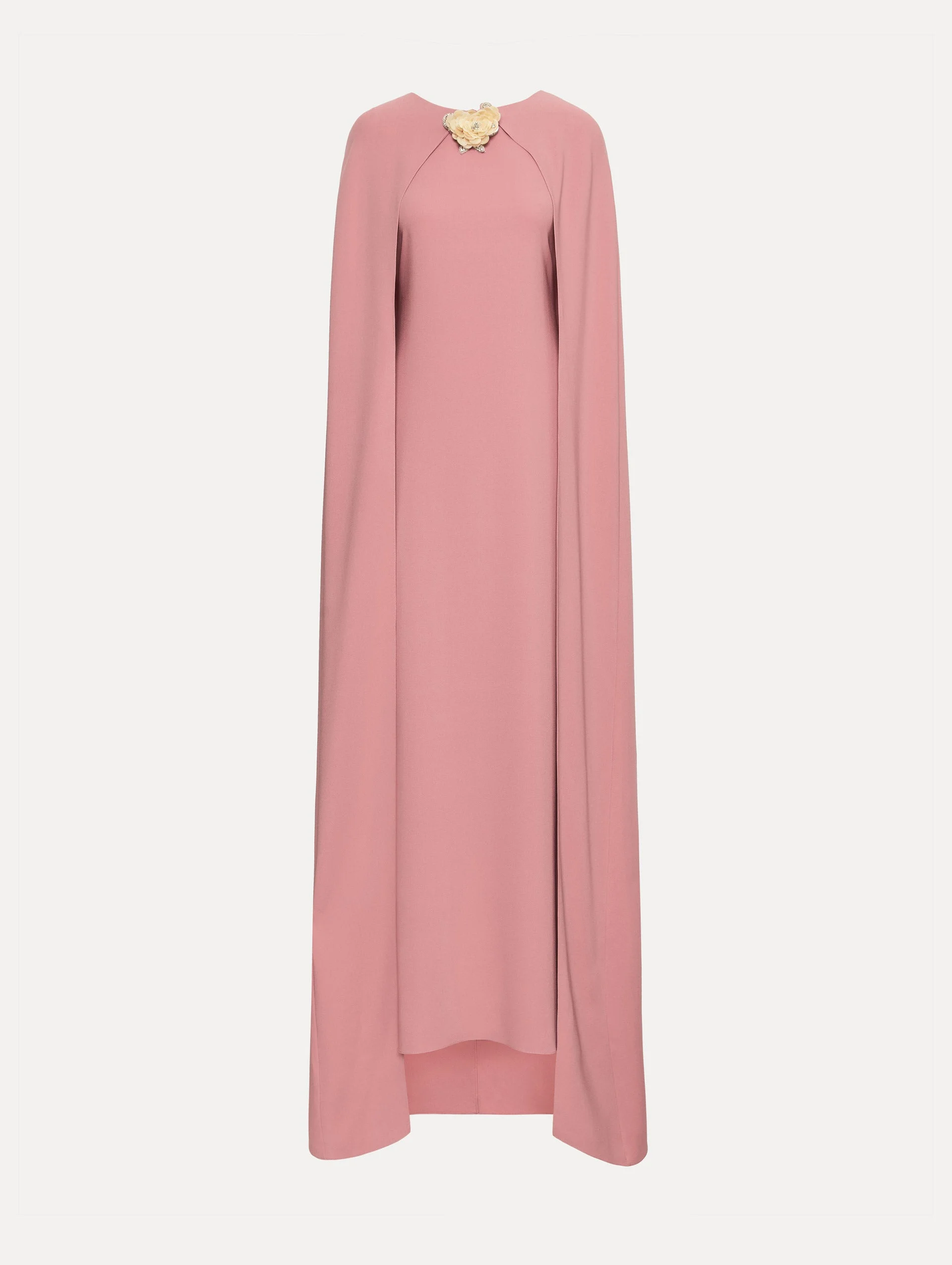 Pearl and crystal embroidery convene in the season’s brooch motif, adding jeweled radiance to this heavy silk stretch georgette caftan. Draped sleeves fall in fluid panels that frame the clean column silhouette, while the floral brooch detail becomes a luminous focal point of sculptural elegance. Details - Cape Back - Jewel Neckline - Floor-Sweeping Hemline with Short Train - Concealed Back Zipper - Unlined - Country of Origin: India - Style Code: 26RN915HSG_ANR Materials & Care - 94% Silk, 6% Elastane - Dry clean only.