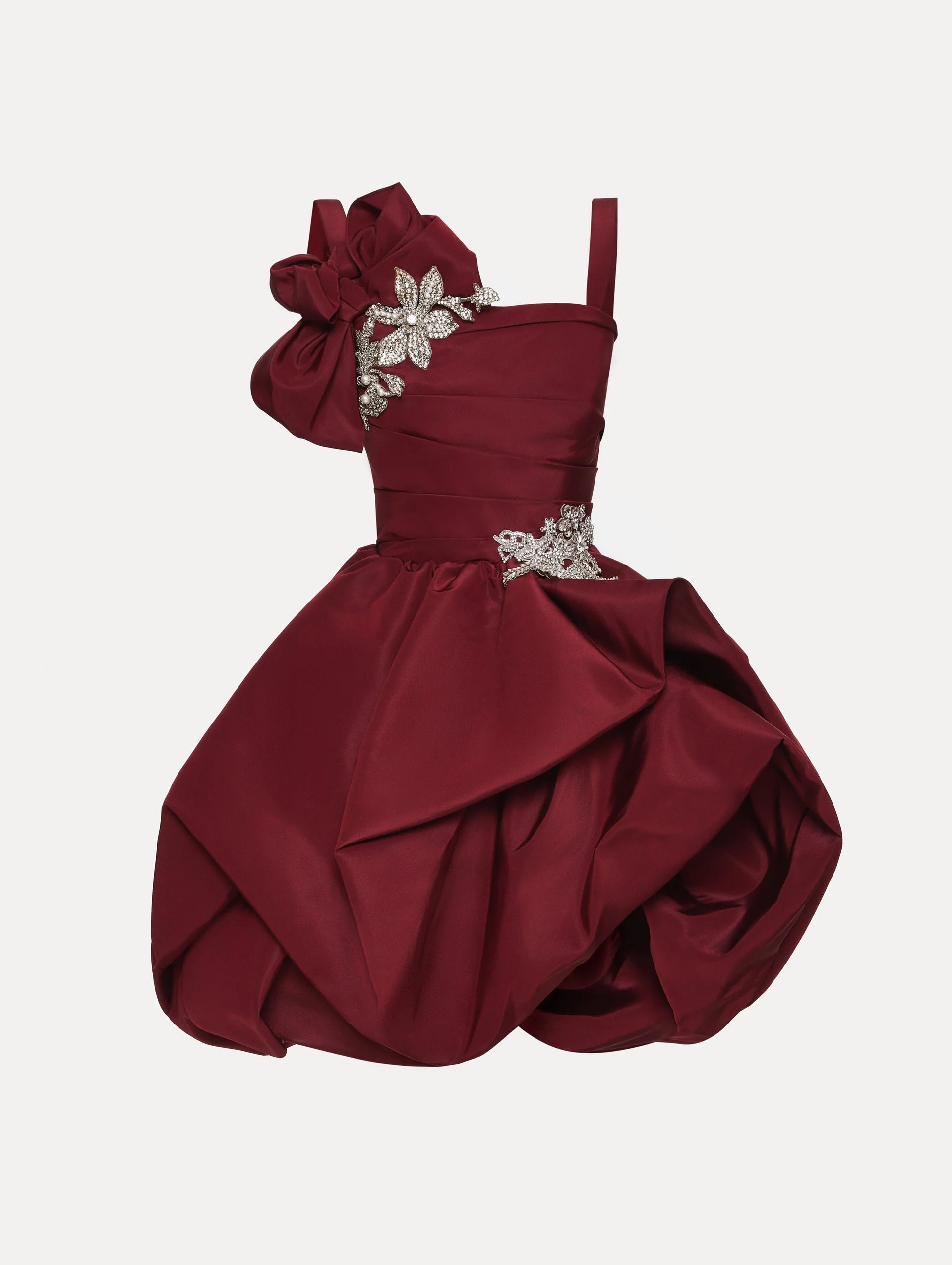 Pearl and crystal embroidery convene in the season’s brooch motif, adding a jeweled radiance to the sculptural silk faille silhouette of this cocktail dress, complete with an oversized shoulder bow and voluminous draped skirt. Details - Sleeveless - Square Neckline - Concealed Back Zipper - Internal Bustier - Lined - Style Code: 26RE634FAI_MRL - Country of Origin: USA Materials & Care - 100% Silk, Lining: 100% Polyester - Spot clean only - Do not dry clean, iron, steam, bleach, or wash
