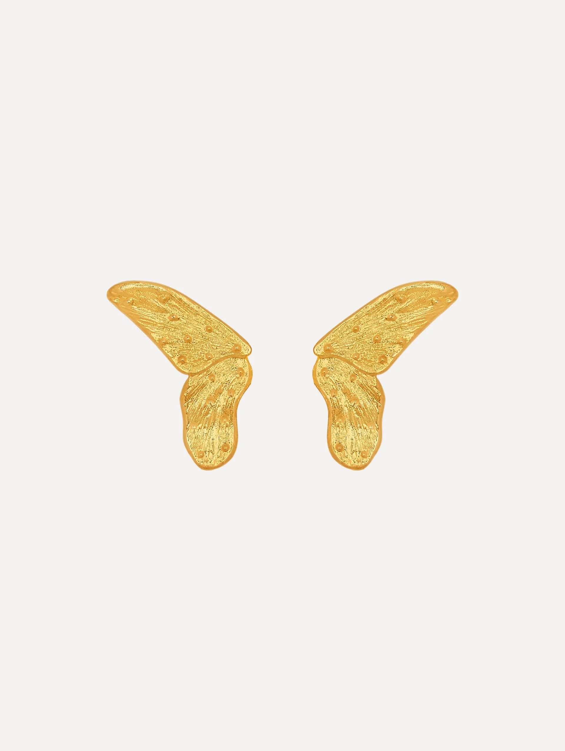 These gold earrings offer a striking, sculptural take on the classic butterfly motif. Designed as mirrored halves, each earring forms a single wing, framing the face with an artful asymmetry. Details - Dimensions: 40 mm x 33 mm - Weight: 26 grams - Clip Backs with Comfort Pads - Style Code: P25J116_GOL - Country of Origin: Italy Materials & Care - 100% Brass
