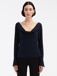 THE PERFECT PAIRING FOR THIS SEASON'S SEPARATES, THIS COWL NECK BLOUSE IS CUT FROM A SMOOTH SILK-BLEND AND IS FINISHED WITH FLORAL BUTTON FASTENING CUFFS. LONG SLEEVES WITH BUTTON CUFFS / COWL NECKLINE / PULLOVER STYLE / CONCEALED SIDE ZIPPER / HIP LENGTH / DRY CLEAN DIMENSIONS: MODEL IS 5'10.5" / 180 CM AND WEARING SIZE 2 MATERIAL: SELF: 92% SILK, 8% ELASTANE; COMBO 100% POLYAMIDE MADE IN INDIA STYLE 23FN7032HSG_NAV