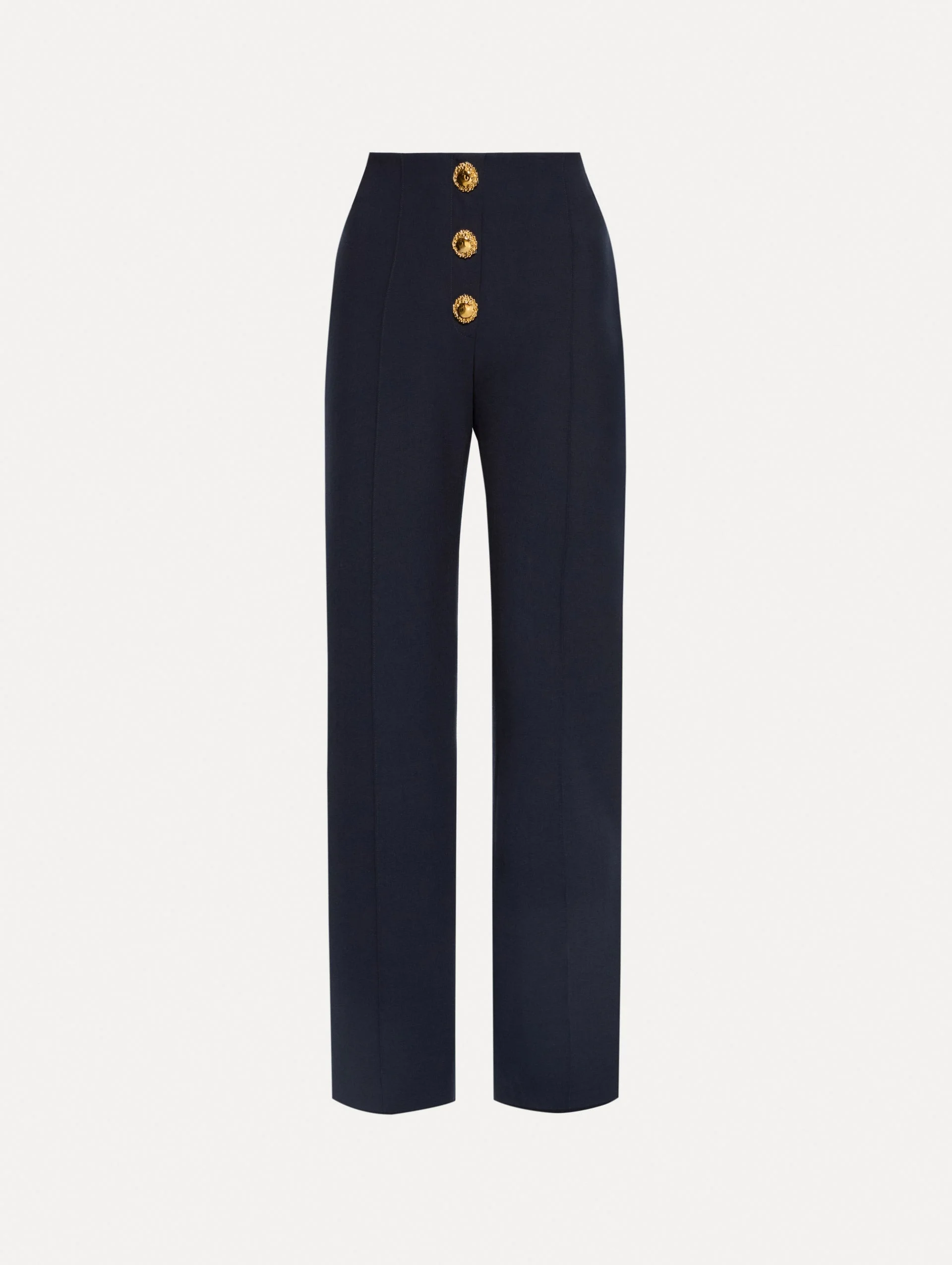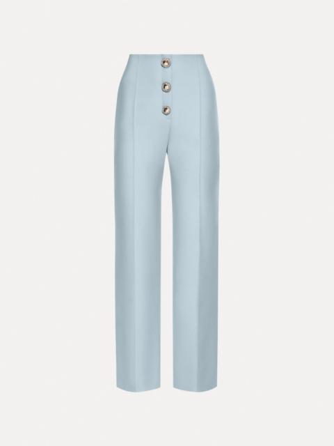 Tailored from stretch wool, these high-waisted pants are defined by elongating pintuck seams and a trio of sculptural buttons at the waist. The tapered leg offers a modern finish, while the soft blue hue lends a fresh take on classic tailoring. Details - High Waisted - Banded Waist - Zip Front with Hook-and-Bar Closure - Non-Functional Buttons - Straight Leg Silhouette - Gold-Tone Hardware - Unlined - Style Code: 25FN3222DSW_NGD - Country of Origin: USA Materials & Care - - 94% Virgin Wool, 5% Elastane, 1% Polyamide - - Dry clean only.