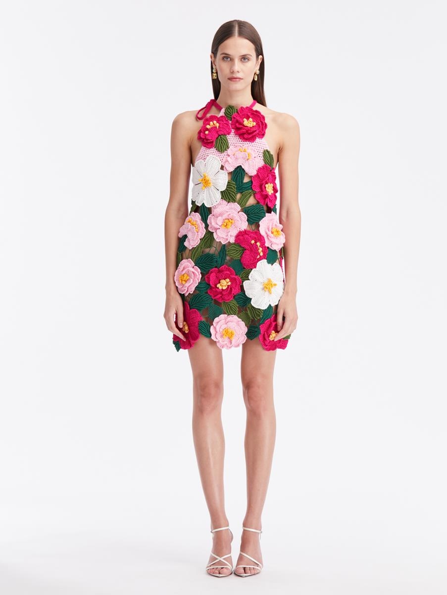 A TRUE STANDOUT FROM THE PRE-SPRING COLLECTION, THIS MINI DRESS IS DELICATELY CROCHETED FROM SOFT COTTON AND EMBROIDERED WITH A MEDLEY OF CAMELLIAS. SLEEVELESS / SELF-TIE HALTER NECKLINE / PULLOVER STYLE / MID-THIGH LENGTH / ASYMMETRICAL HEMLINE / LINED / DRY CLEAN DIMENSIONS: MODEL IS 5'10" / 180 CM AND WEARING SIZE S MATERIAL: KNIT: 100% COTTON, LINING: 100% POLYESTER STRETCH MADE IN USA STYLE 24RN185GRD_FUS