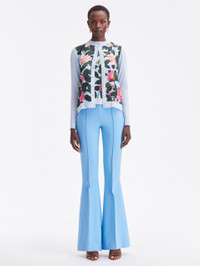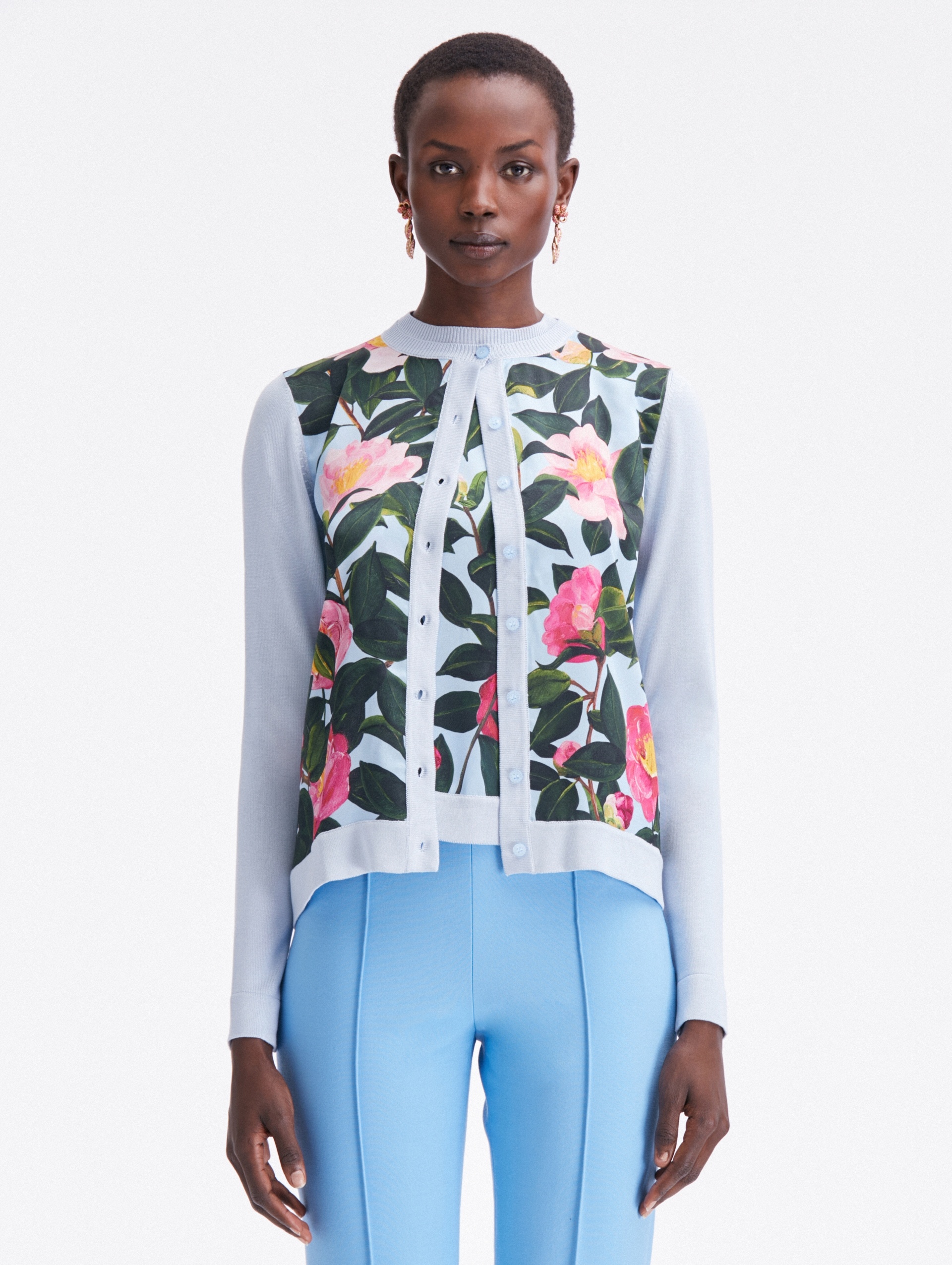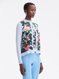 KNIT IN A SOFT SHADE OF PALE BLUE, THIS TIMELESS OVERLAYER FEATURES A CAMELLIA PRINTED PANELED FRONT. THIS BUTTON FRONT CARDIGAN IS A PERFECT PAIRING FOR COLOR-COMPLEMENTARY SEPARATES OR ITS COORDINATING TANK FOR OPTIMAL VERSATILITY. LONG SLEEVES / CREW NECKLINE / BUTTON FRONT / SLIM FIT / RIBBED TRIM / UNLINED / DRY CLEAN DIMENSIONS: MODEL IS 5'10.5" / 180 CM AND WEARING SIZE 2 MATERIAL: 55% SILK, 45% VISCOSE; FABRIC: 100% POLYESTER MADE IN ITALY STYLE 24RN155CAM_PPB