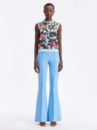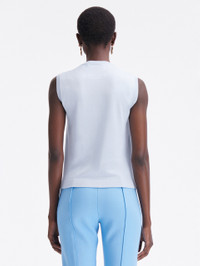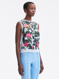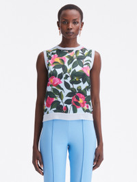 KNIT IN A SOFT SHADE OF PALE BLUE, THIS CLASSIC TANK FEATURES A CAMELLIA-PRINTED PANELED FRONT. THIS PIECE IS A PERFECT PAIRING FOR COLOR-COMPLEMENTARY SEPARATES OR ITS COORDINATING TANK FOR OPTIMAL VERSATILITY. SLEEVELESS / CREW NECKLINE / SLIM FIT / HIP LENGTH / PULLOVER STYLE / RIBBED TRIM / UNLINED / DRY CLEAN DIMENSIONS: MODEL IS 5'10.5" / 180 CM AND WEARING SIZE 2 MATERIAL: 55% SILK, 45% VISCOSE; FABRIC: 100% POLYESTER MADE IN ITALY STYLE 24RN154CAM_PPB