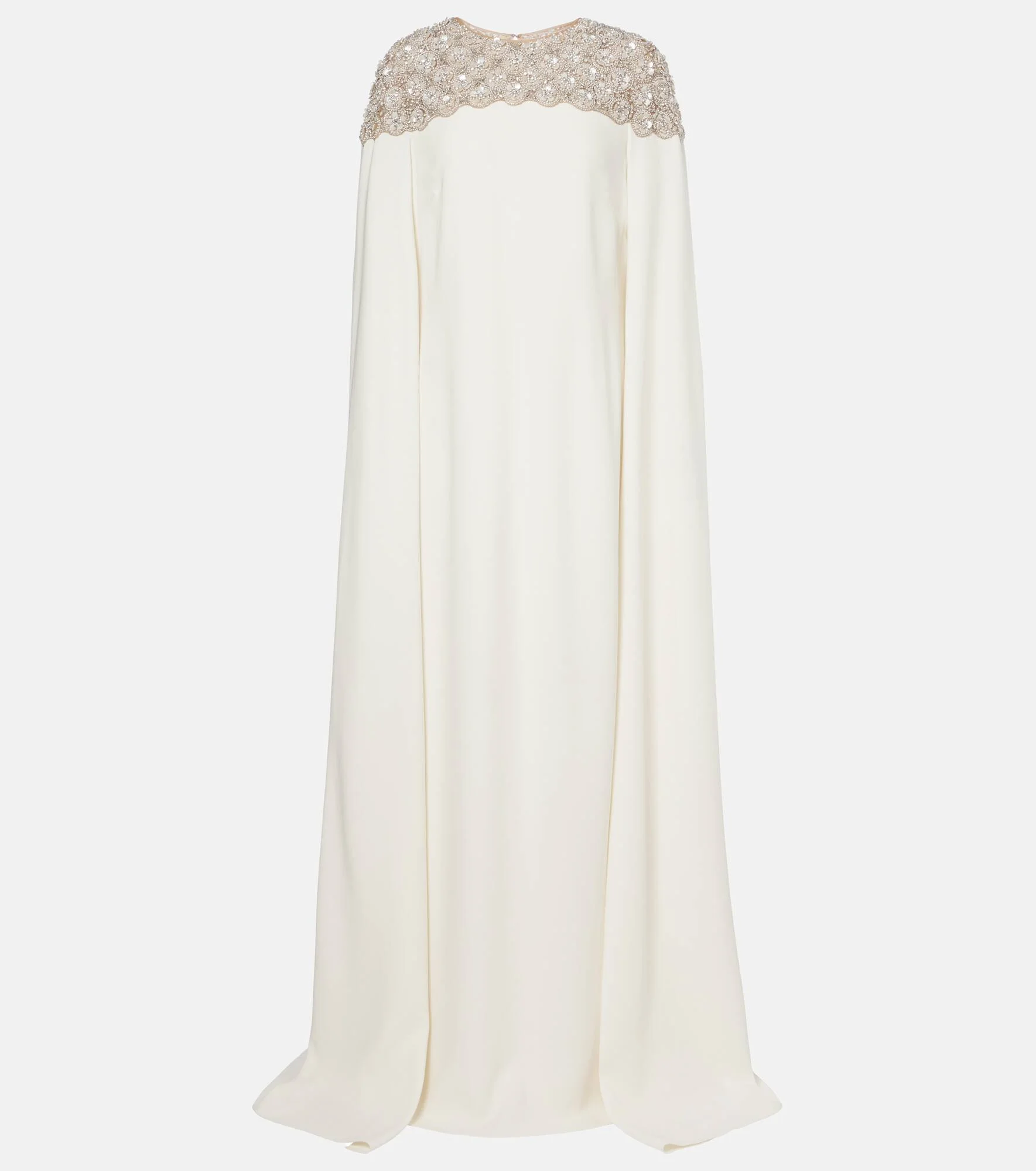Oscar de la Renta's grandiose gowns are designed to grace red carpets and ballrooms. Made from a luxurious silk blend, this design boasts a striking caped silhouette and shimmering embellishments at the neckline. Product Details - Material: 94% silk, 6% elastane - Care instructions: spot clean - Made in India - Designer color name: Ivory - Item color: white - Details: 100% polyamide - Lining: 100% silk - Hardware color: silver - Closure: concealed zipped back, hook fastening - Item number: P01123676 Size & Fit - True to size - Extra-long sleeves - Fitted - Non-stretchy fabric - The model seen in the picture is 178cm-5'10" and wearing a size XS