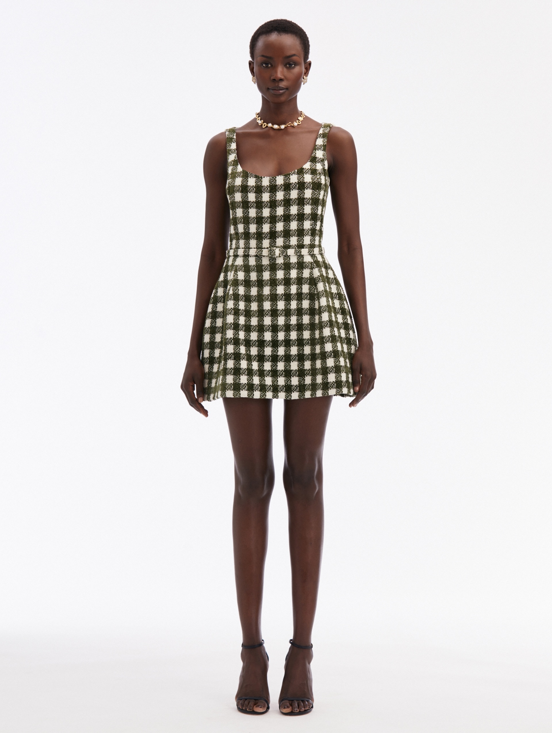 BOTH A STATEMENT AND A STAPLE, THIS DRESS IS CRAFTED FROM CHENILLE TWEED AND FINISHED WITH A CHECKERED PATTERN. THIS TIMELESS MINI FEATURES A SWEEPING NECKLINE AND A SELF-BELT WITH A GOLD-TONE BOW DETAIL. SLEEVELESS / SCOOP NECKLINE / MID-THIGH LENGTH / SIDE SEAM POCKETS / REMOVABLE, COORDINATING NOVELTY BELT / CONCEALED BACK ZIPPER / GOLD-TONE HARDWARE / DRY CLEAN DIMENSIONS: MODEL IS 5'10.5" / 180 CM AND WEARING SIZE 2 MATERIAL: 48% VIRGIN WOOL, 37% POLYESTER, 12% ACRYLIC, 3% POLYMIDE MADE IN ITALY STYLE 24FN221CCE_IOL
