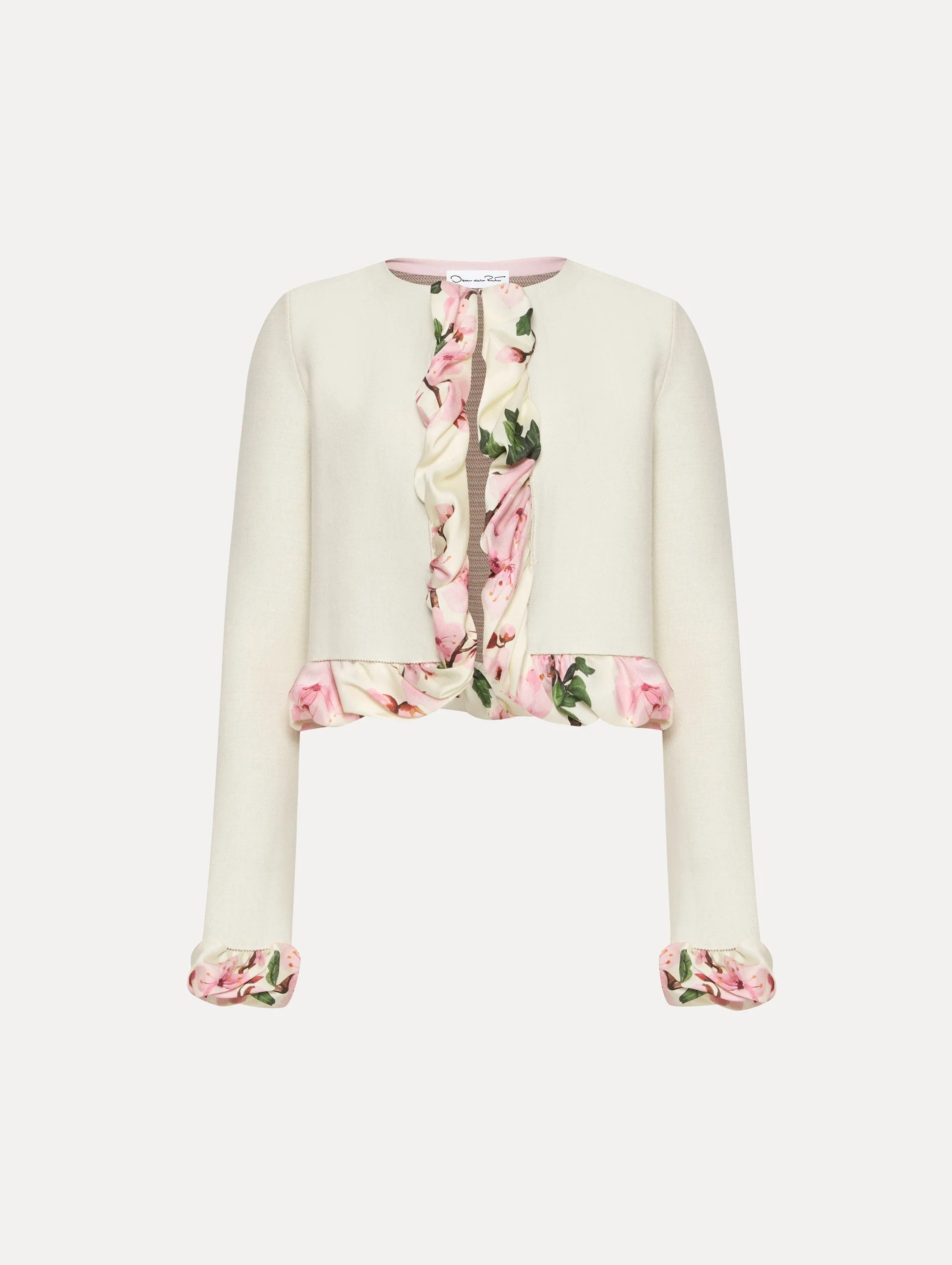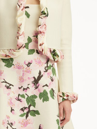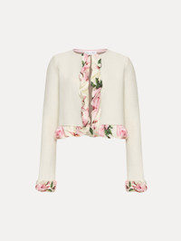 Cut in a soft shade of ecru, this cardigan is defined by a bubble twist trim printed with delicate cherry blossoms. The intricate detailing adds a romantic touch to the timeless silhouette, seamlessly blending texture and print. Details - Long Sleeves - Jewel Neckline - Cropped Silhouette - Open Front - Style Code: 25PN178FPD_ECR - Country of Origin: Italy Materials & Care - 69% Viscose, 28% Polyester, 2% Polyamide, 1% Elastane