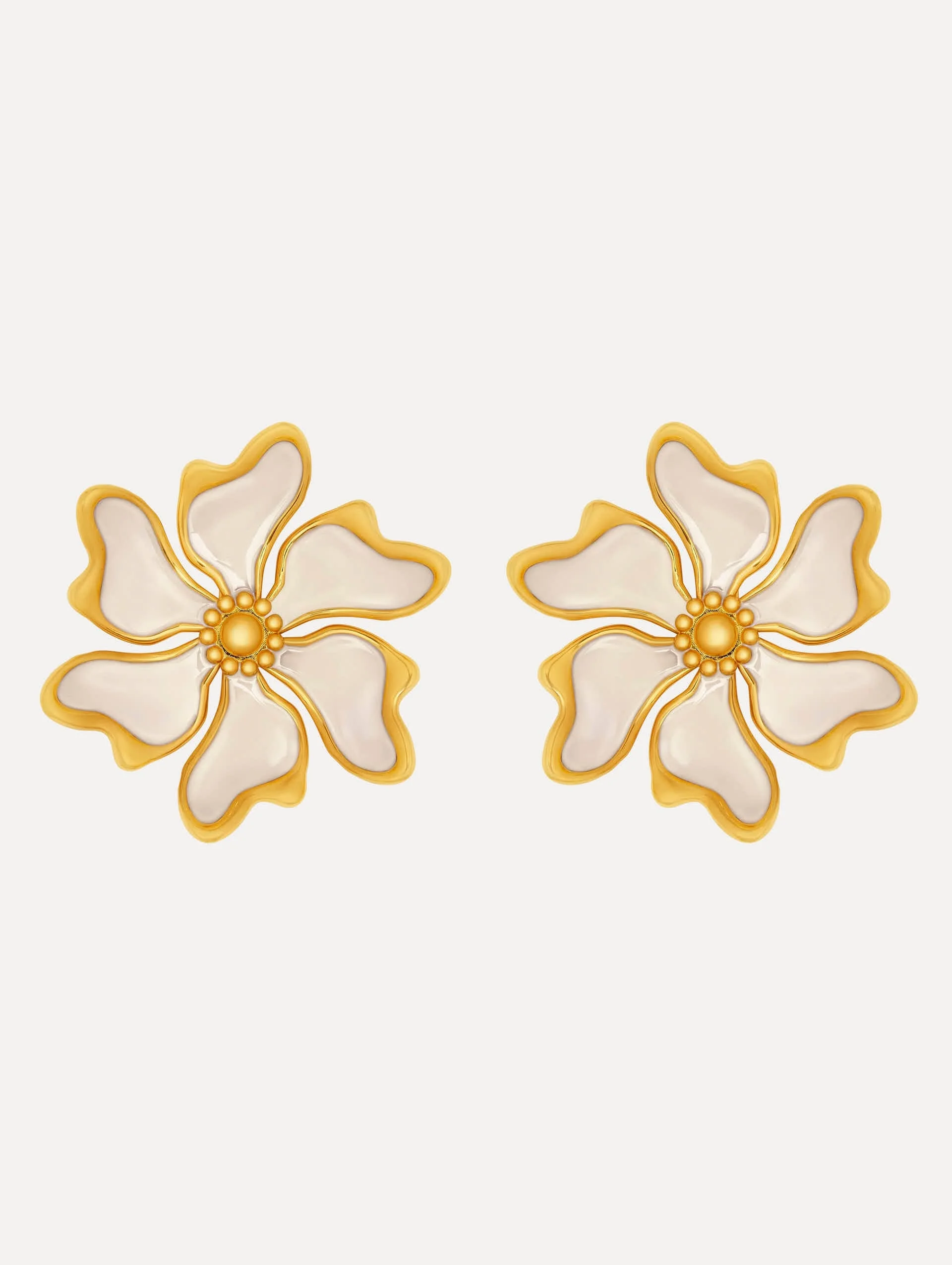 These enameled earrings offer a playful take on the season’s signature bloom. Set in gold-tone metal, the petals are washed in a solid ivory hue, their fluid form capturing a sense of movement and charm. Details - Dimensions: 5.5 cm - Weight: 30 grams - Clip Backs with Comfort Pads - Style Code: P25J904_IVR - Country of Origin: Italy Materials & Care - 99% Brass, 1% Enamel