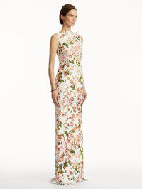 The picture of timeless femininity, this column gown is crafted entirely from cherry blossom guipure lace, its intricate design creating a delicate illusion atop the skin. Details - Sleeveless - Bateau Neckline - Column Silhouette - Concealed Back Zipper - Semi-Sheer - 100% Silk Lining - Style Code: 25PN038CPG_PKV - Country of Origin: Italy Materials & Care - 100% Polyester; Lining: 100% Silk