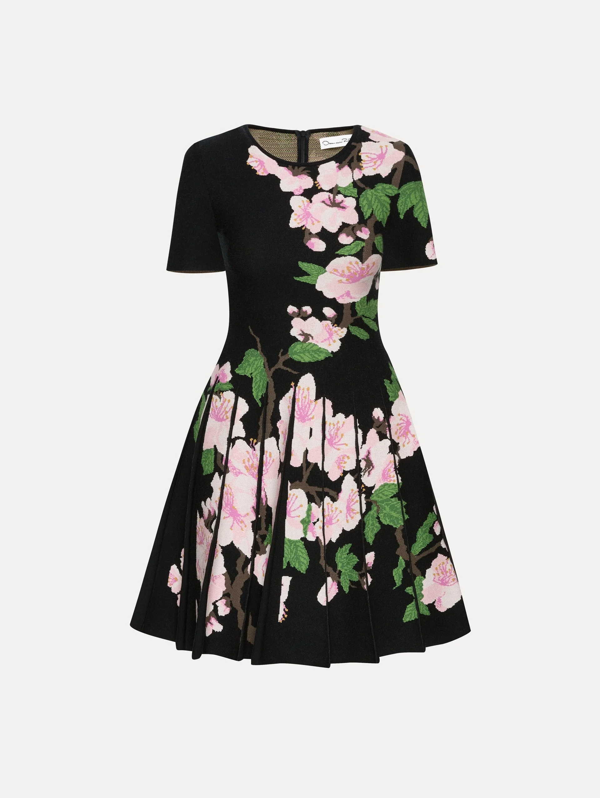 This jacquard dress is printed with all-over cherry blossoms. Expertly pleated to reveal contrasting glimpses of navy, the silhouette creates a dynamic sense of depth. Details - Short Sleeves - Jewel Neckline - Fit-and-Flare Silhouette - Concealed Back Zipper - Unlined - Style Code: 25PN112CHB_NVP - Country of Origin: Italy Materials & Care - 69% Viscose, 27% Polyester, 3% Polyamide, 1% Elastane