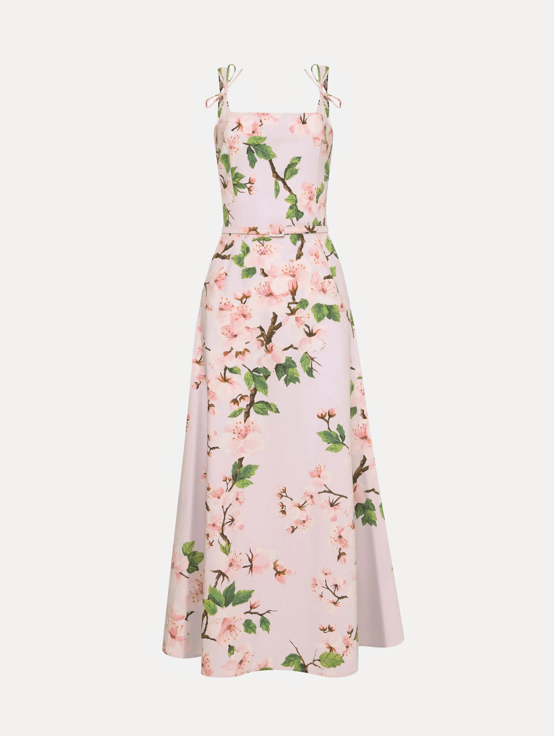 Printed with cherry blossoms that climb the silhouette in a poetic display of nature’s beauty, this cotton poplin dress is framed by bow-detailed straps and cinched at the waist with a self-belt, creating an effortlessly romantic shape. Details - Self-Tie Shoulder Straps - Square Neckline - Removable, Coordinating Buckle Belt with Belt Loops - Concealed Back Zipper - Unlined - Style Code: 25PN211CBO_PKL - Country of Origin: Italy Materials & Care - 97% Cotton, 3% Elastane
