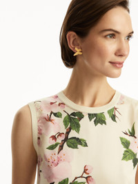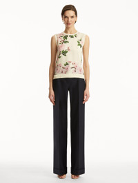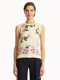 This classic tank features a cherry blossom silk paneled front. This piece is a perfect pairing for color-complementary separates or its coordinating cardigan for optimal versatility. Details - Sleeveless - Crew Neckline - Pullover Style - Ribbed Trim - Unlined - Style Code: 25PN154ACB_PIE - Country of Origin: Italy Materials & Care - 55% Silk, 45% Viscose