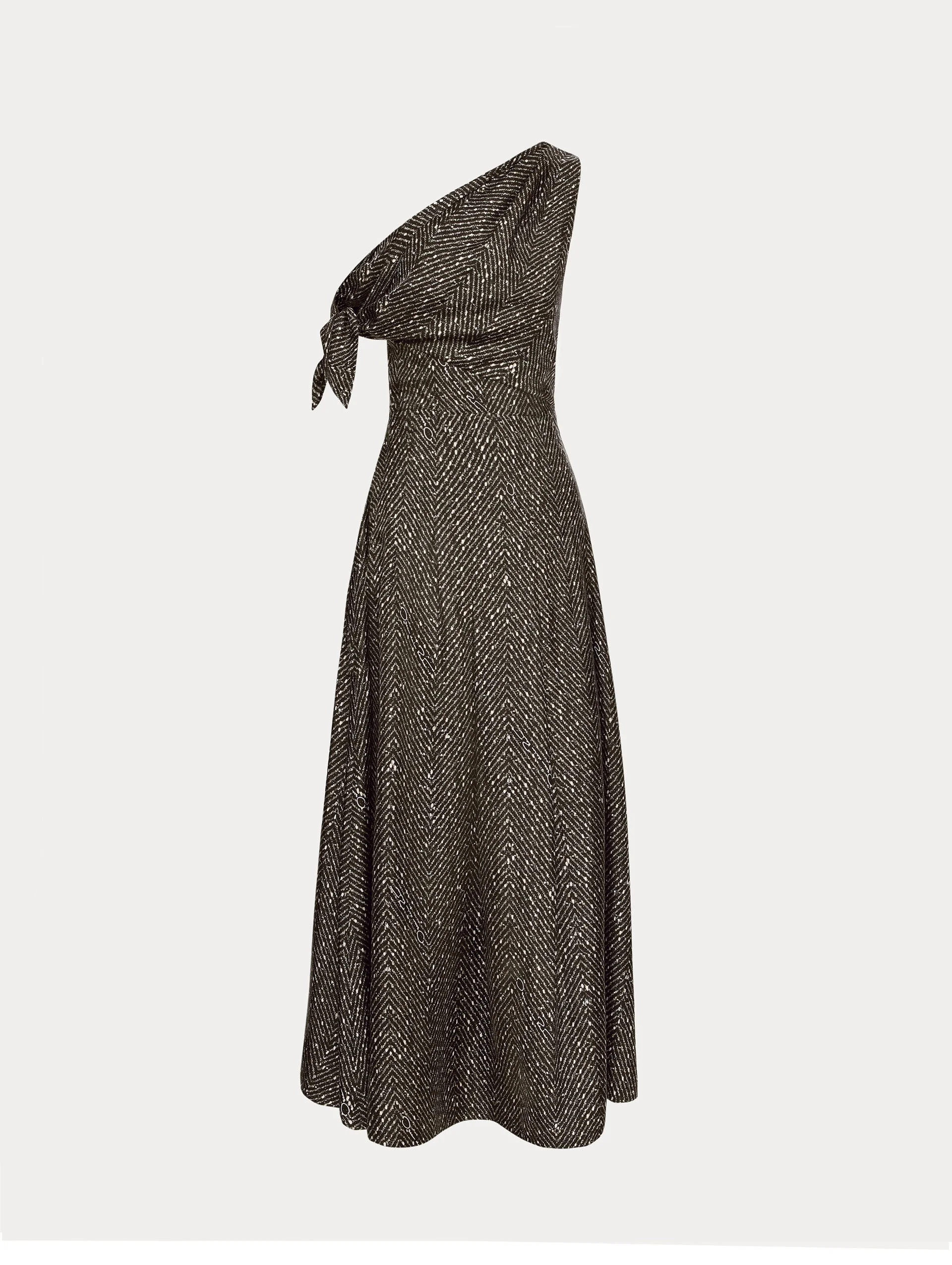 This one-shoulder silk twill dress is printed with a refined chevron motif that enhances its clean, tailored silhouette. A knotted detail at the shoulder adds sculptural softness, while the fluid skirt lends graceful movement to the polished design. Details - Off-Shoulder - Removable, Coordinating Belt - Concealed Back Zipper - Unlined - Country of Origin: Italy - Style Code: 26RN268TVK_BKH Materials & Care - 100% Silk - Dry clean only.
