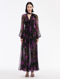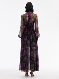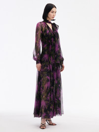 THIS LONG SLEEVE MAXI DRESS IS CUT FROM SILK CHIFFON AND PRINTED WITH THIS SEASON'S SPIDER CHRYSANTHEMUM MOTIF IN DEEP HUES OF PURPLE AND NAVY. WITH VOLUMINOUS LONG SLEEVES AND A SELF-TIE NECKLINE, THIS PIECE IS PERFECTLY SUITED FOR ANY OCCASION. LONG SLEEVES / BANDED COLLAR WITH SELF-TIE CLOSURE / CONCEALED BUTTON FRONT / FULL LENGTH / SLIP / DRY CLEAN DIMENSIONS: MODEL IS 5'10.5" / 180 CM AND WEARING SIZE 2 MATERIAL: 100% SILK MADE IN ITALY STYLE 24FN915SRH_PRN