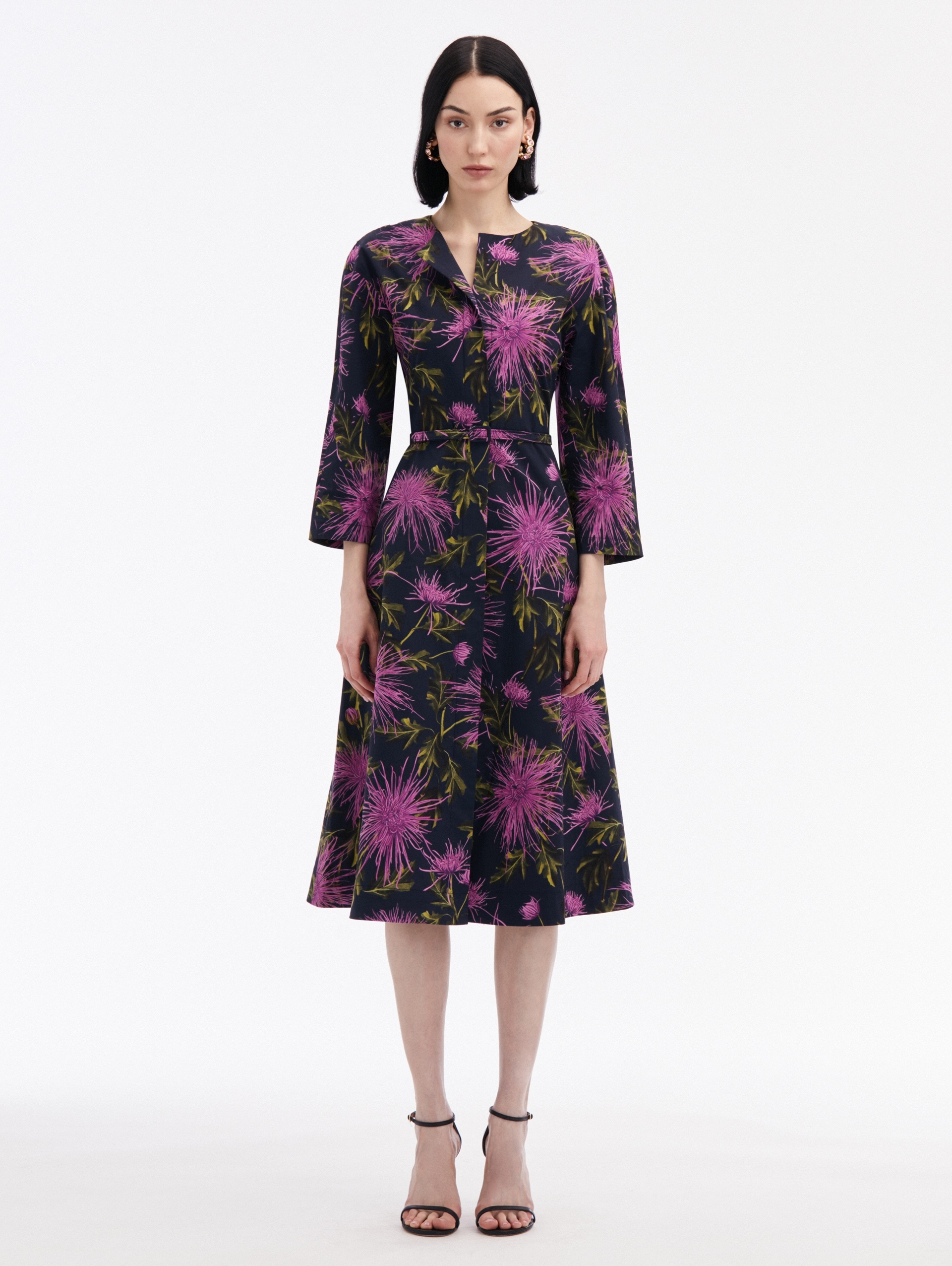 CUT FROM OSCAR DE LA RENTA'S SIGNATURE COTTON POPLIN AND PRINTED WITH THIS SEASON'S SPIDER CHRYSANTHEMUM MOTIF, THIS DRESS IS FINISHED WITH THREE-QUARTER-LENGTH SLEEVES AND A SELF-BELT. THREE-QUARTER-LENGTH SLEEVES / SPREAD COLLAR / CONCEALED ZIPPER FRONT / BELOW THE KNEE LENGTH / REMOVABLE, COORDINATING BUCKLE BELT WITH BELT LOOPS / UNLINED / DRY CLEAN DIMENSIONS: MODEL IS 5'10.5" / 180 CM AND WEARING SIZE 2 MATERIAL: 97% COTTON, 3% ELASTANE MADE IN ITALY STYLE 24FN248SDN_PRN