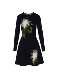 KNIT IN A DEEP SHADE OF NAVY, THIS JACQUARD DRESS IS PRINTED WITH LARGE-SCALE SPIDER CHRYSANTHEMUMS. BOASTING A FIT-AND-FLARE SILHOUETTE WITH LONG SLEEVES, THIS STYLE IS THE PERFECT ADDITION TO ANY WOMAN'S WARDROBE. LONG SLEEVES / ROUND NECKLINE / FIT-AND-FLARE SILHOUETTE / MID-THIGH LENGTH / CONCEALED BACK ZIPPER / UNLINED / DRY CLEAN DIMENSIONS: MODEL IS 5'10.5" / 180 CM AND WEARING SIZE XS MATERIAL: 69% VISCOSE, 28% POLYESTER, 2% POLYAMIDE, 1% ELASTANE MADE IN ITALY STYLE 24FN112SPC_WHN