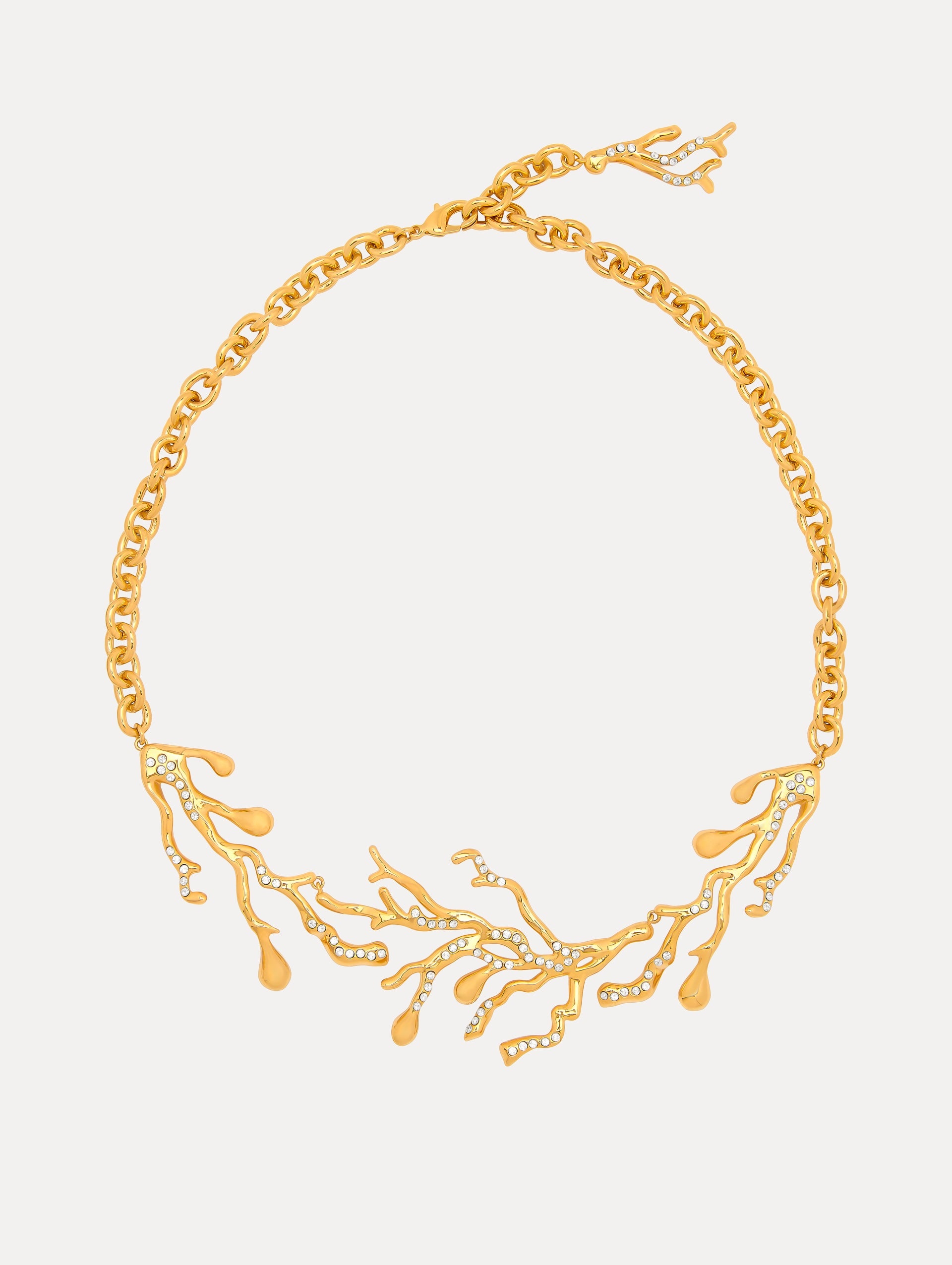 Sculpted from cascading gold drops, this necklace flows organically, creating a dynamic, fluid silhouette that evokes the natural beauty of coral. The gleaming gold finish adds a luxurious touch, while the intricate craftsmanship infuses bold sophistication into this standout piece. Details - Dimensions: 28 mm x 28 mm x 32 mm - Weight: 11 Grams - European Crystal Glass - Style Code: R25J805_GOL Materials & Care - 99% Brass, 1% Crystal Glass